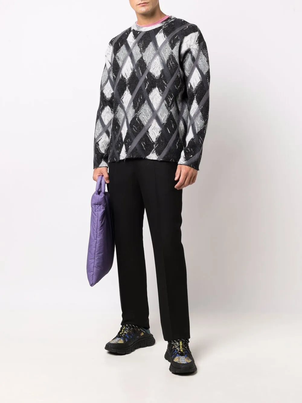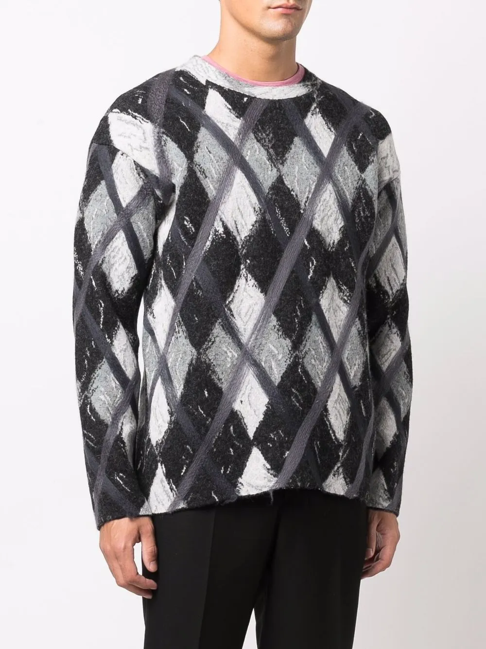 Узор аргайл, круглый вырез, длинные рукава и прямой подол.