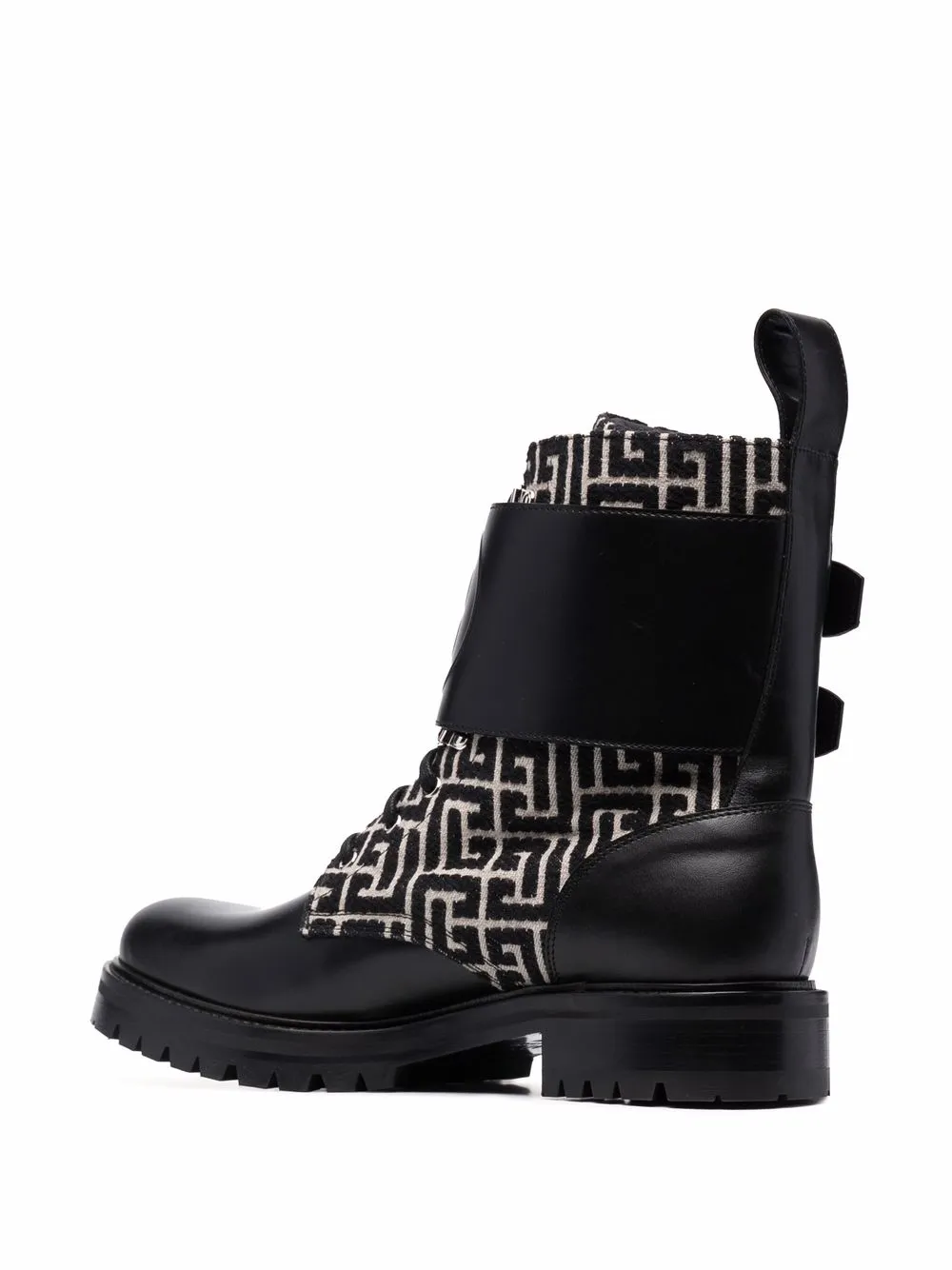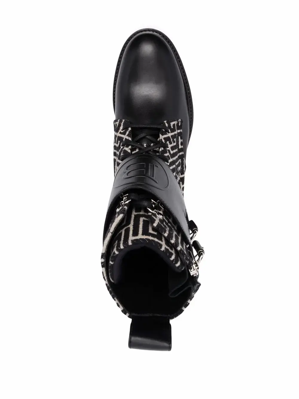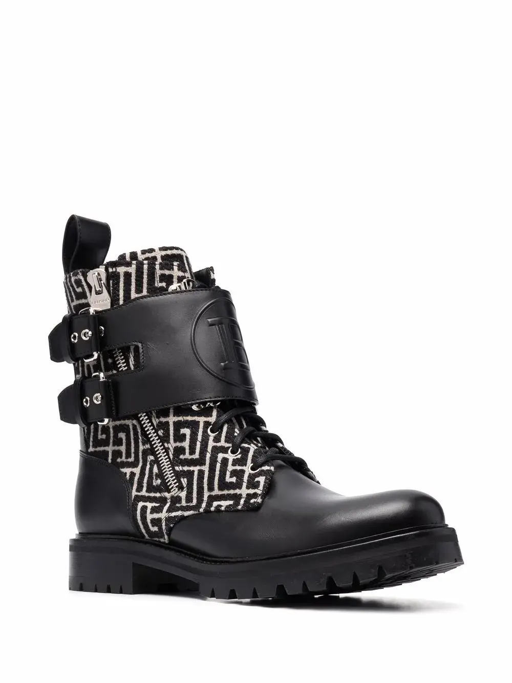 Закругленный носок, узор с изображением монограммы, застежка с тисненым логотипом, застежка с двумя пряжками, шнуровка спереди, петля для подтягивания сзади, застежка на молнии сбоку и ребристая резиновая подошва.