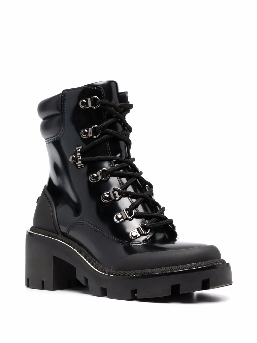 Тисненый логотип сзади, закругленный носок, шнуровка спереди, кожаная стелька с логотипом, низкий блочный каблук и массивная резиновая подошва c протектором. Цвет: черный.