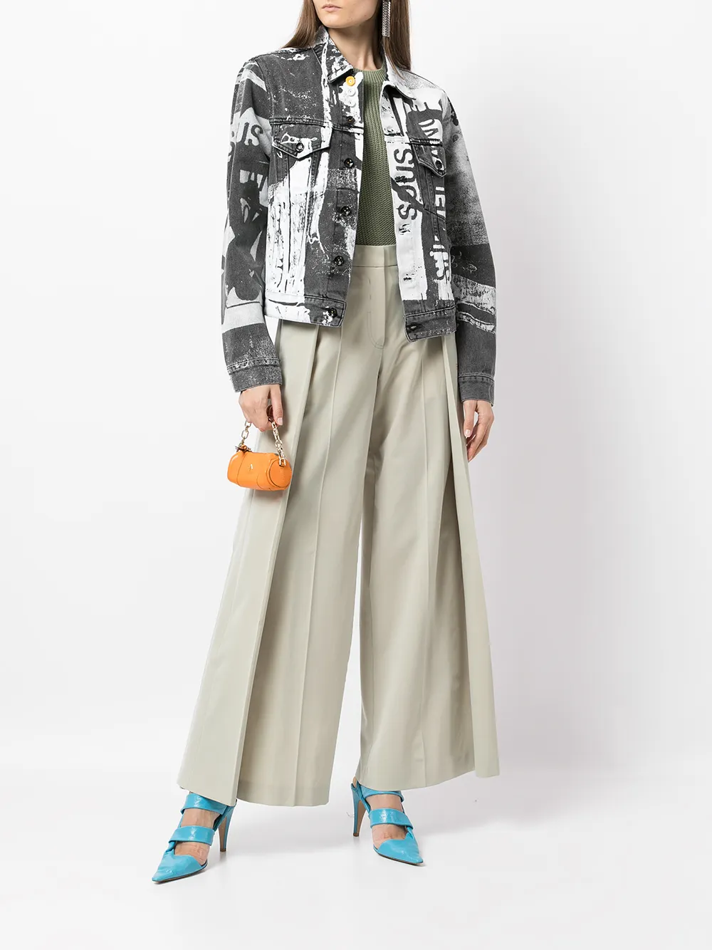 Нашивка с логотипом сзади, плиссировка, контрастные вставки, петли для ремня, потайная застежка спереди и свободный крой.