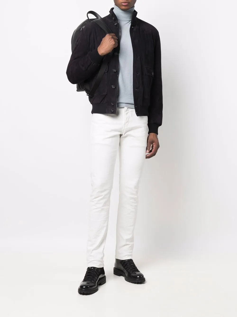 Два кармана с клапанами по бокам, застежка на пуговицах спереди, высокий воротник, длинные рукава, эластичные манжеты и эластичный подол. Цвет: синий.