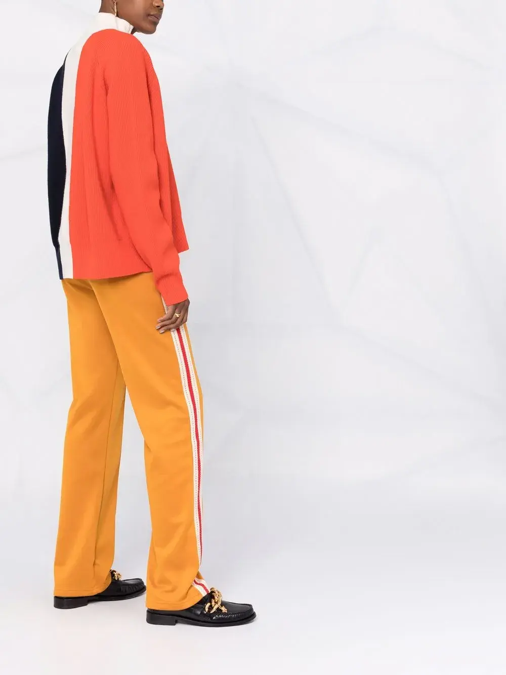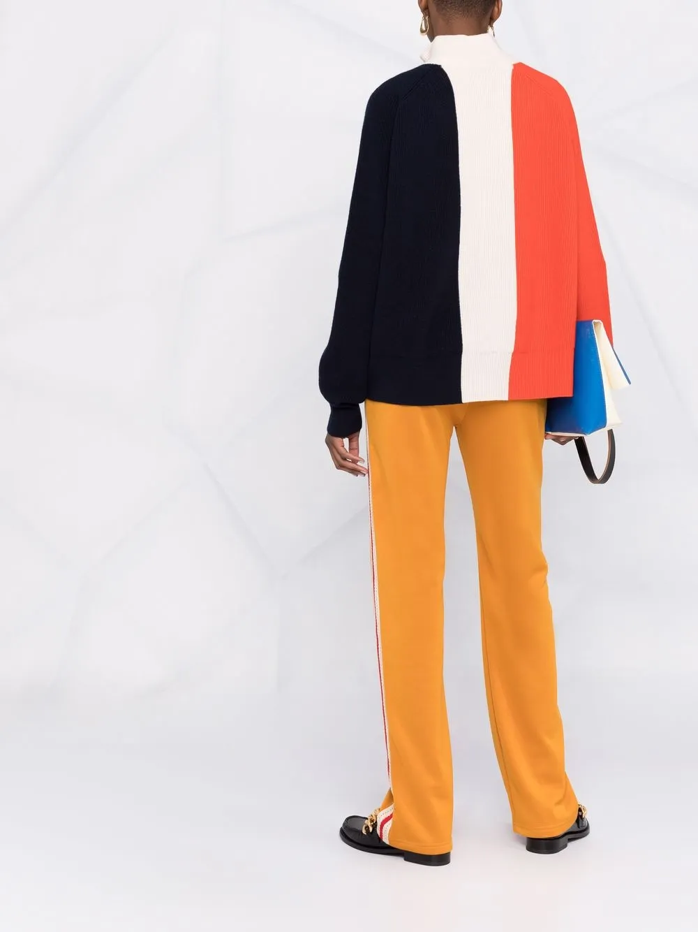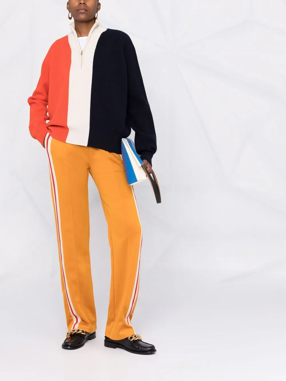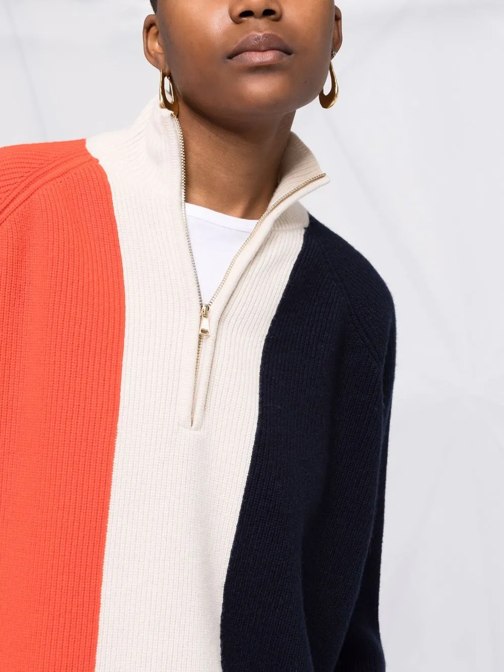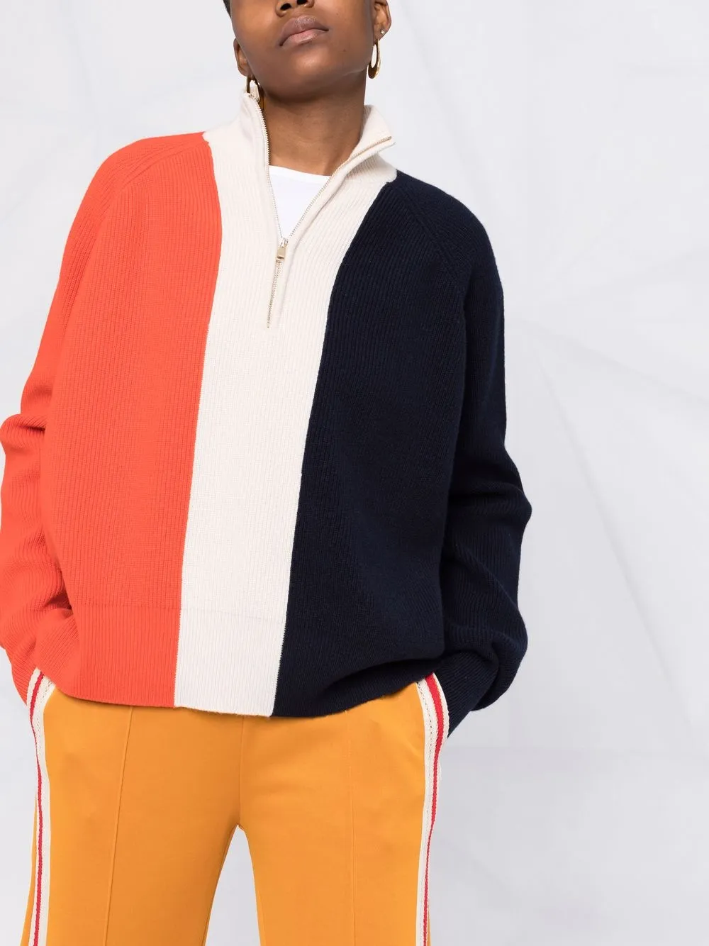Дизайн колор-блок, трикотаж в рубчик, косой воротник, короткая застежка на молнии спереди, длинные рукава и прямой подол.