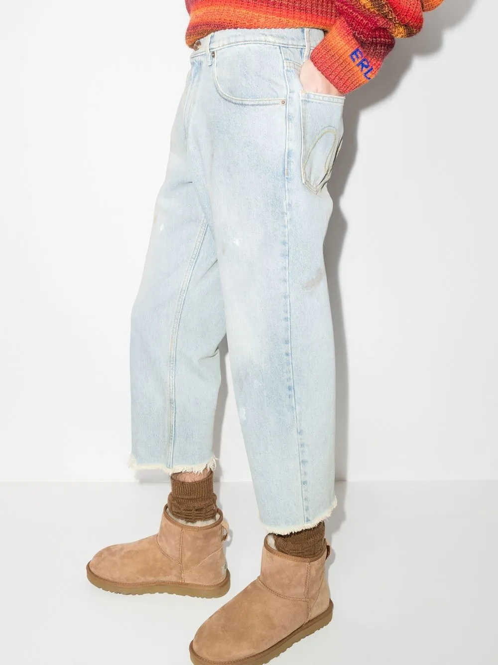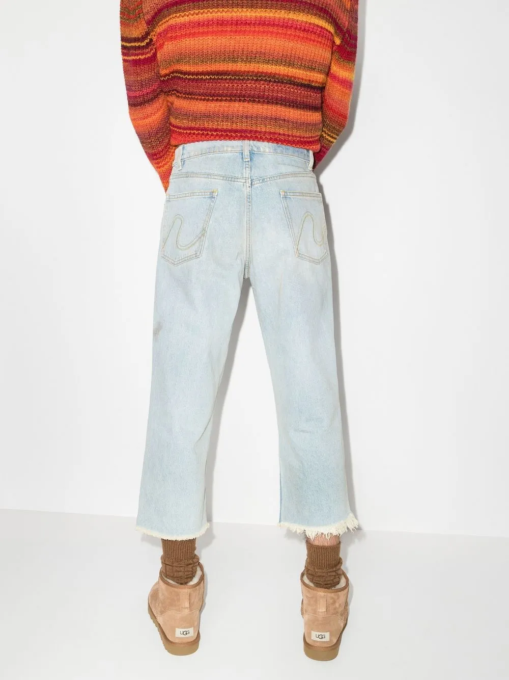 Модель из обработанного денима, эффект потертости, петли для ремня, застежка на молнии и пуговице спереди, классическая пятикарманная модель, прямой крой и укороченная длина.