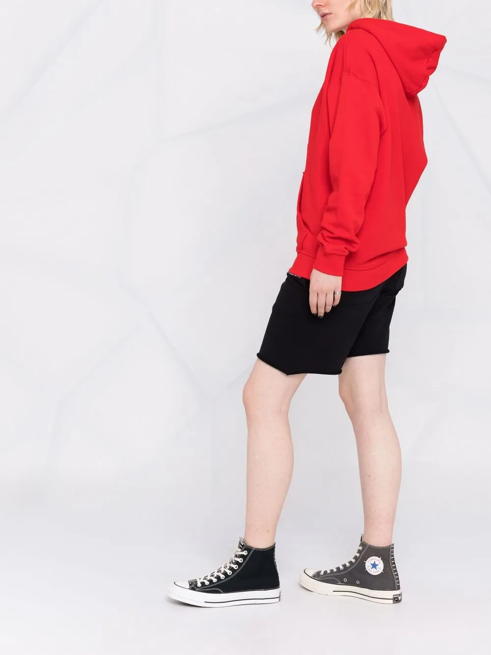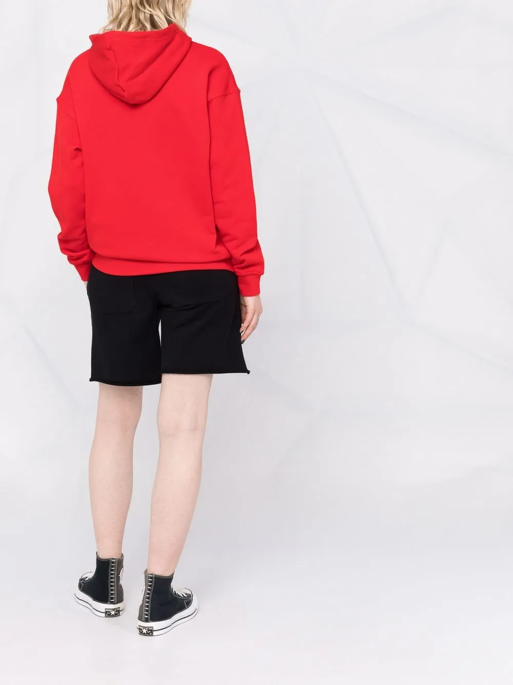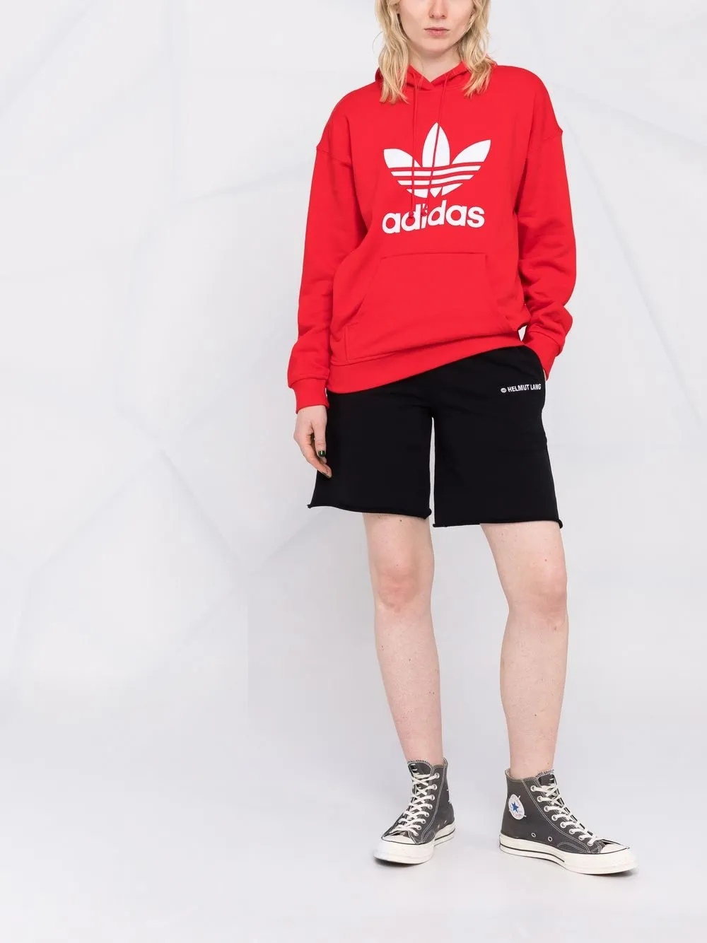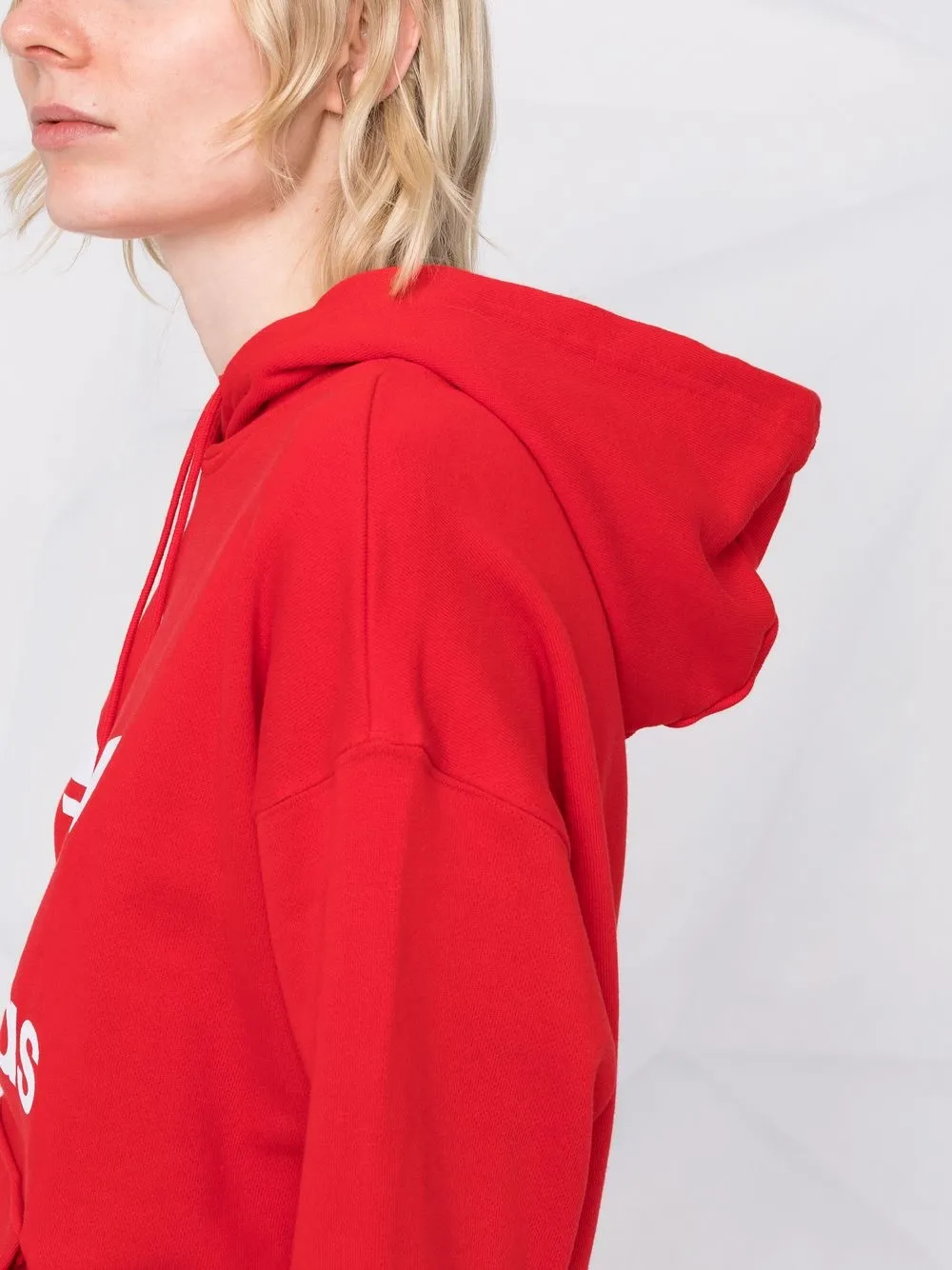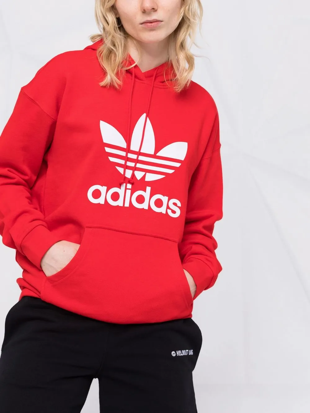 Логотип спереди, затягивающийся на шнурок капюшон, длинные рукава, прямой подол и карман-муфта.