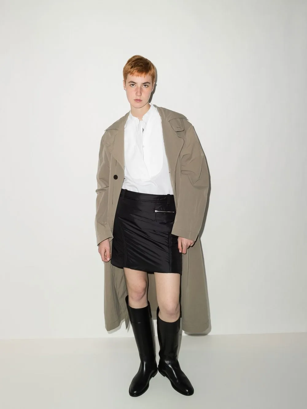 Дутый материал, петли для ремня, два кармана на молнии по бокам, А-образный силуэт, прямой подол и длина до бедер. Цвет: черный.