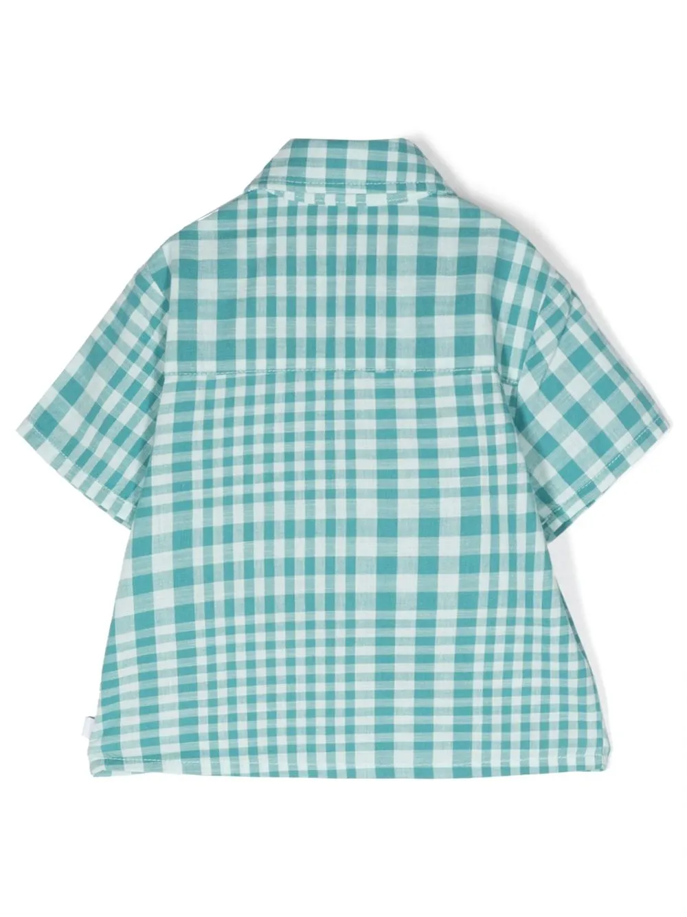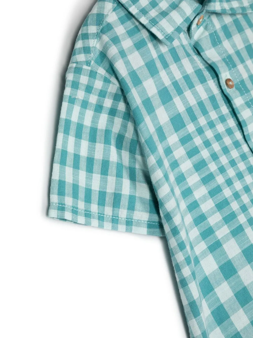 Расцветка Ocean Blue, хлопок, принт в клетку, классический воротник, застежка на пуговицах спереди, короткие рукава и прямой подол.