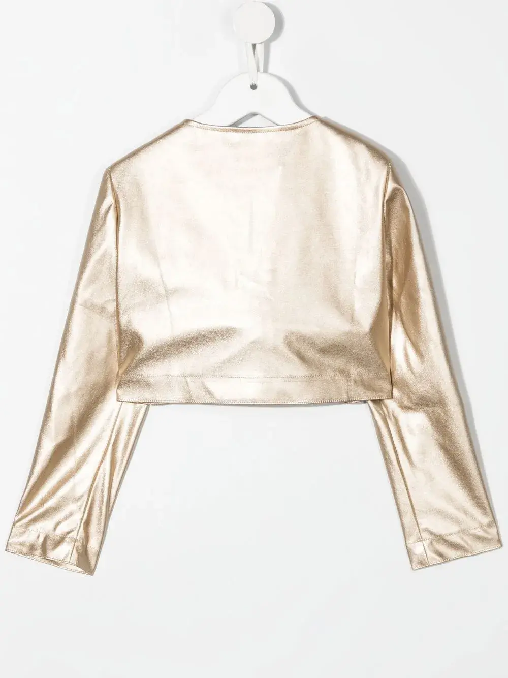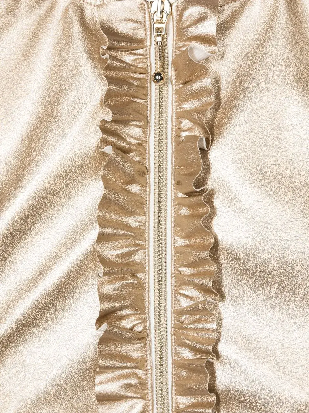 Покрытие с эффектом металлик, вставки с оборками, круглый вырез, застежка на молнии спереди, длинные рукава и прямой подол.