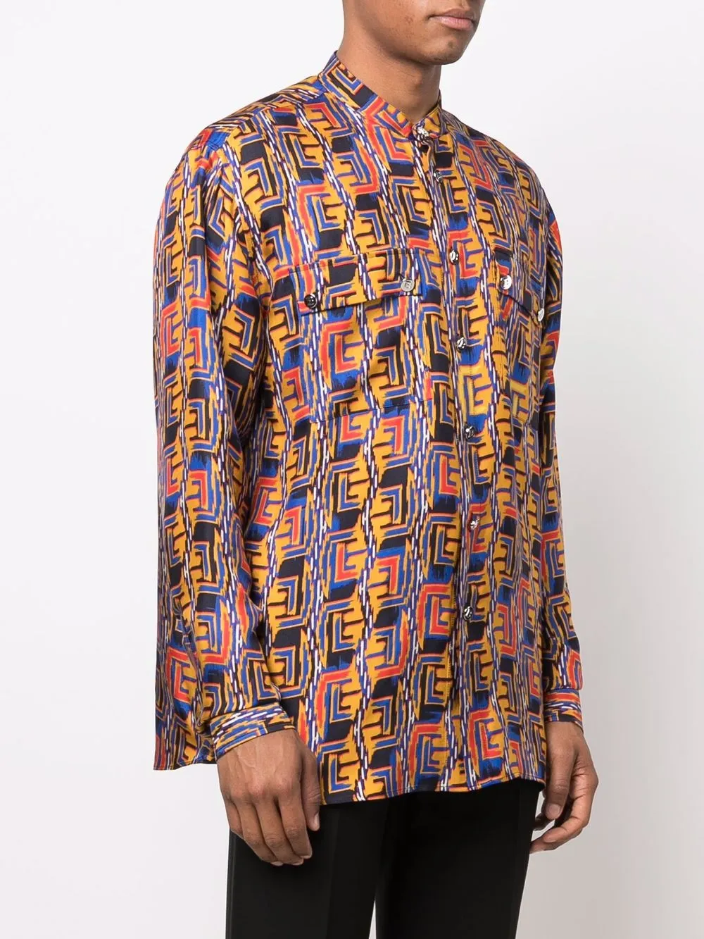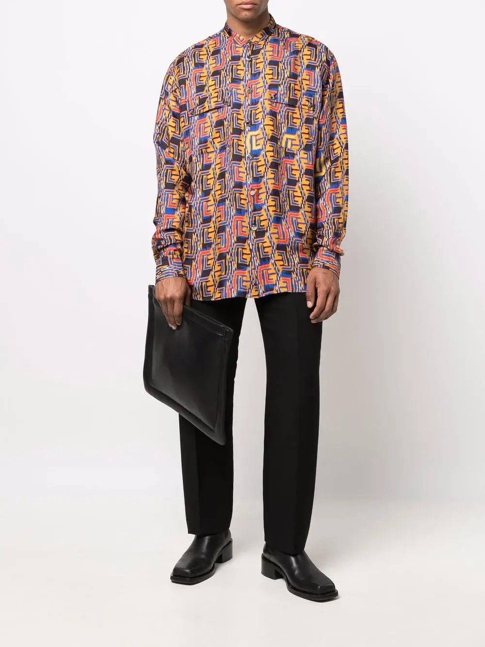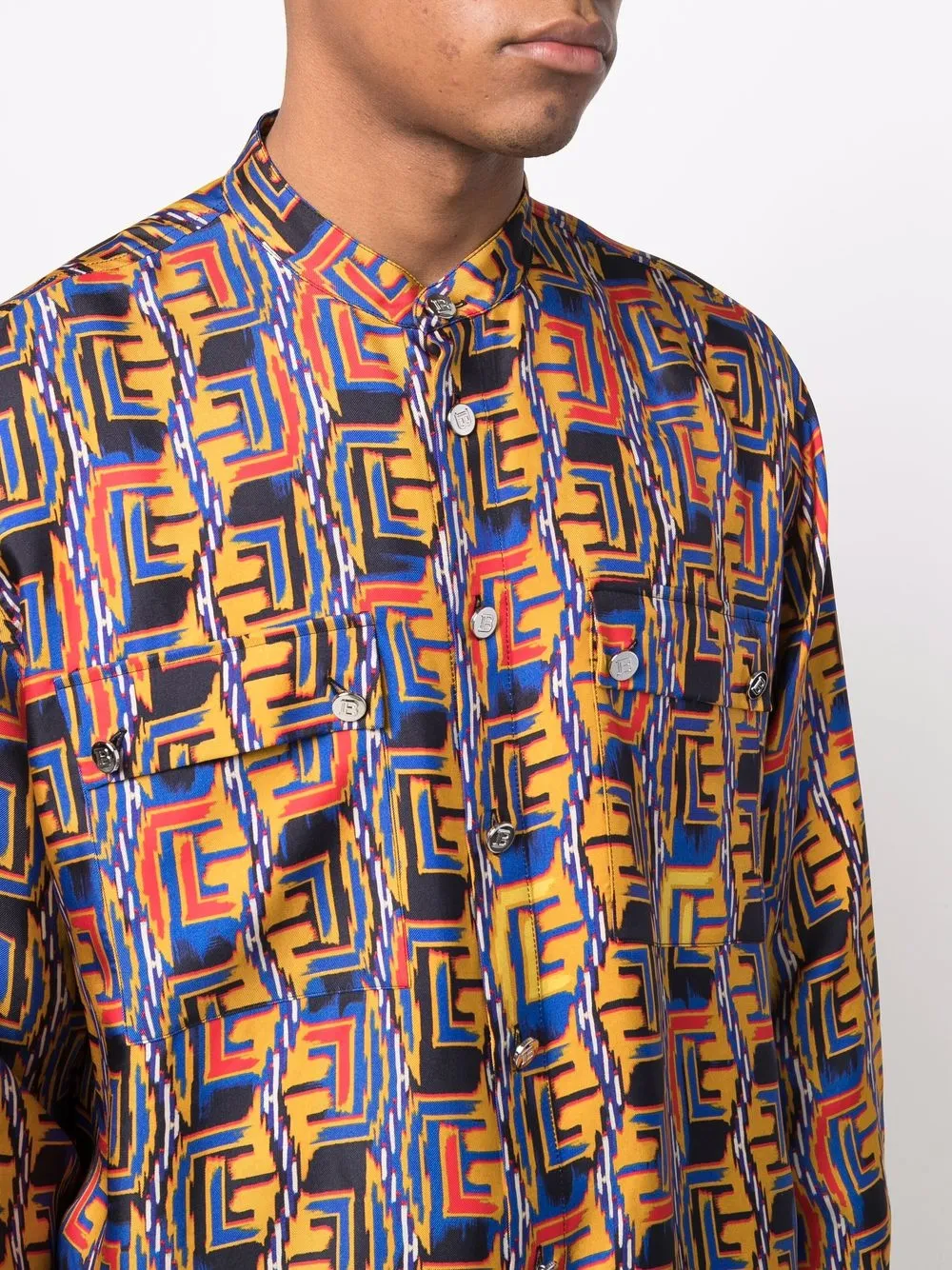 Сплошной графичный принт, воротник-стойка, застежка на пуговицах спереди, длинные рукава и два нагрудных кармана с клапанами. Цвет: разноцветный.