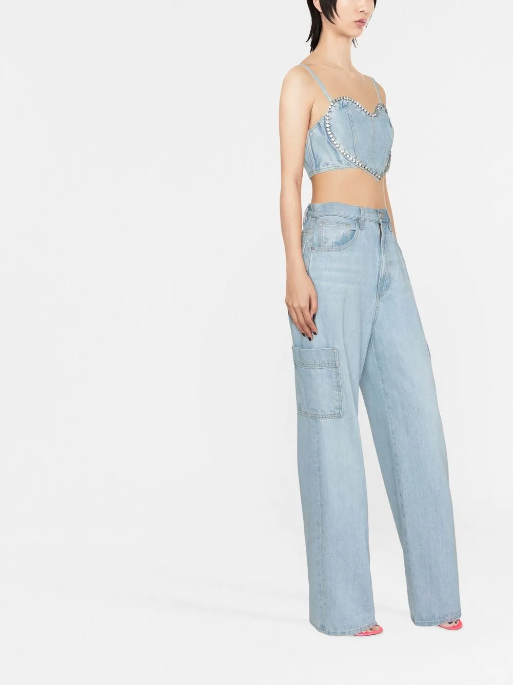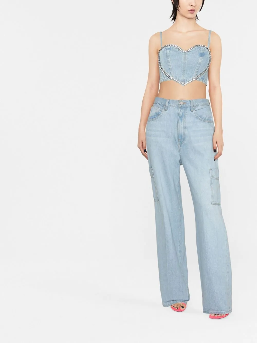 Обработанный деним, декор из кристаллов, узор с сердцами, узкие бретели, без рукавов, укороченная длина и прямой подол.