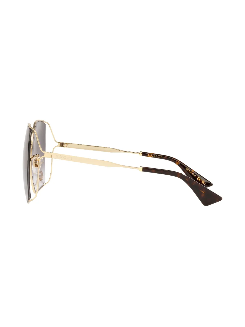 Золотистый, металл, гравированный логотип на дужках, логотип Interlocking G, защитная пленка, оправа оверсайз, затемненные линзы, носоупоры, прямые дужки и дужки с закругленными концами. В комплект входит защитный чехол для очков.