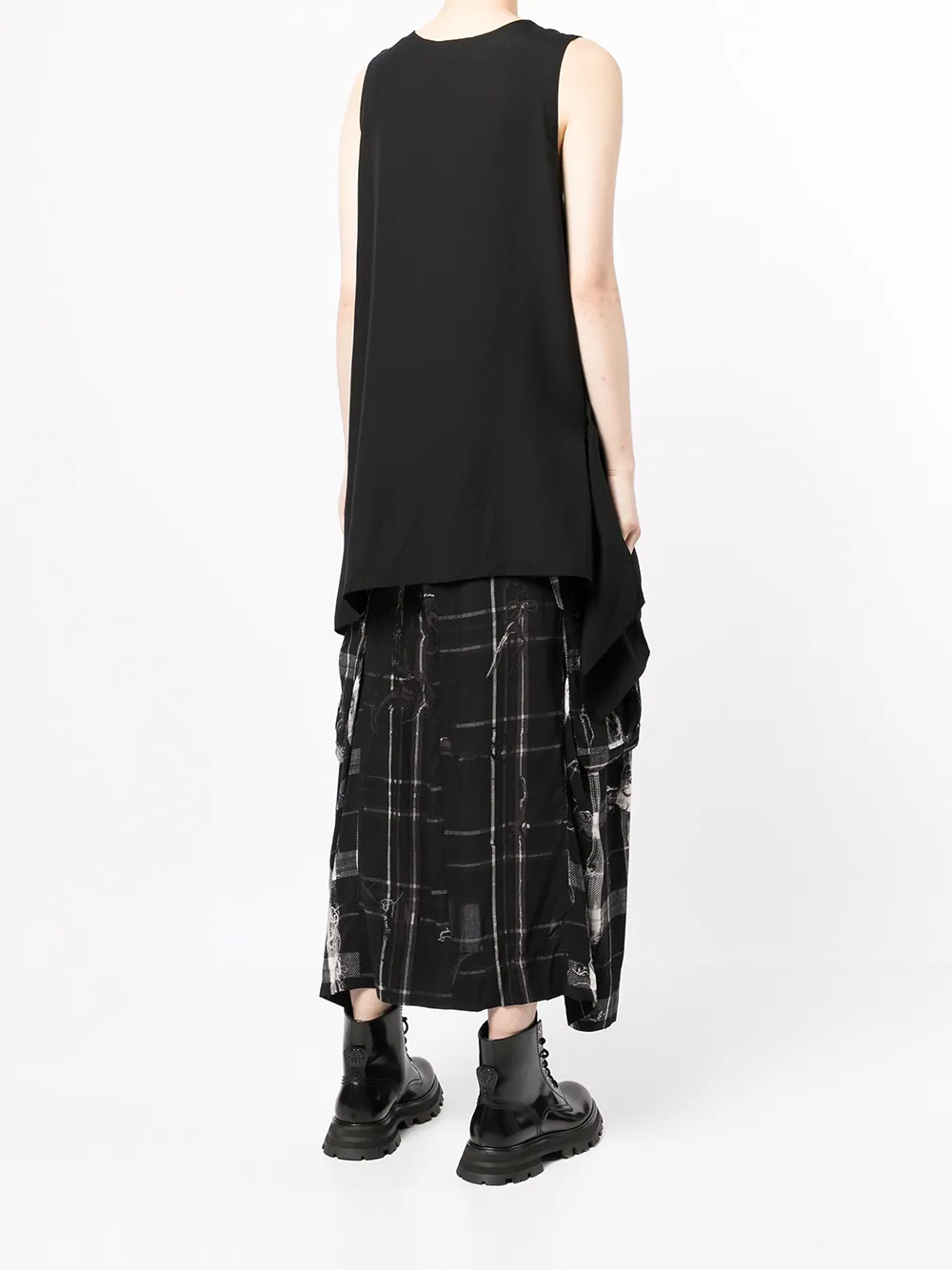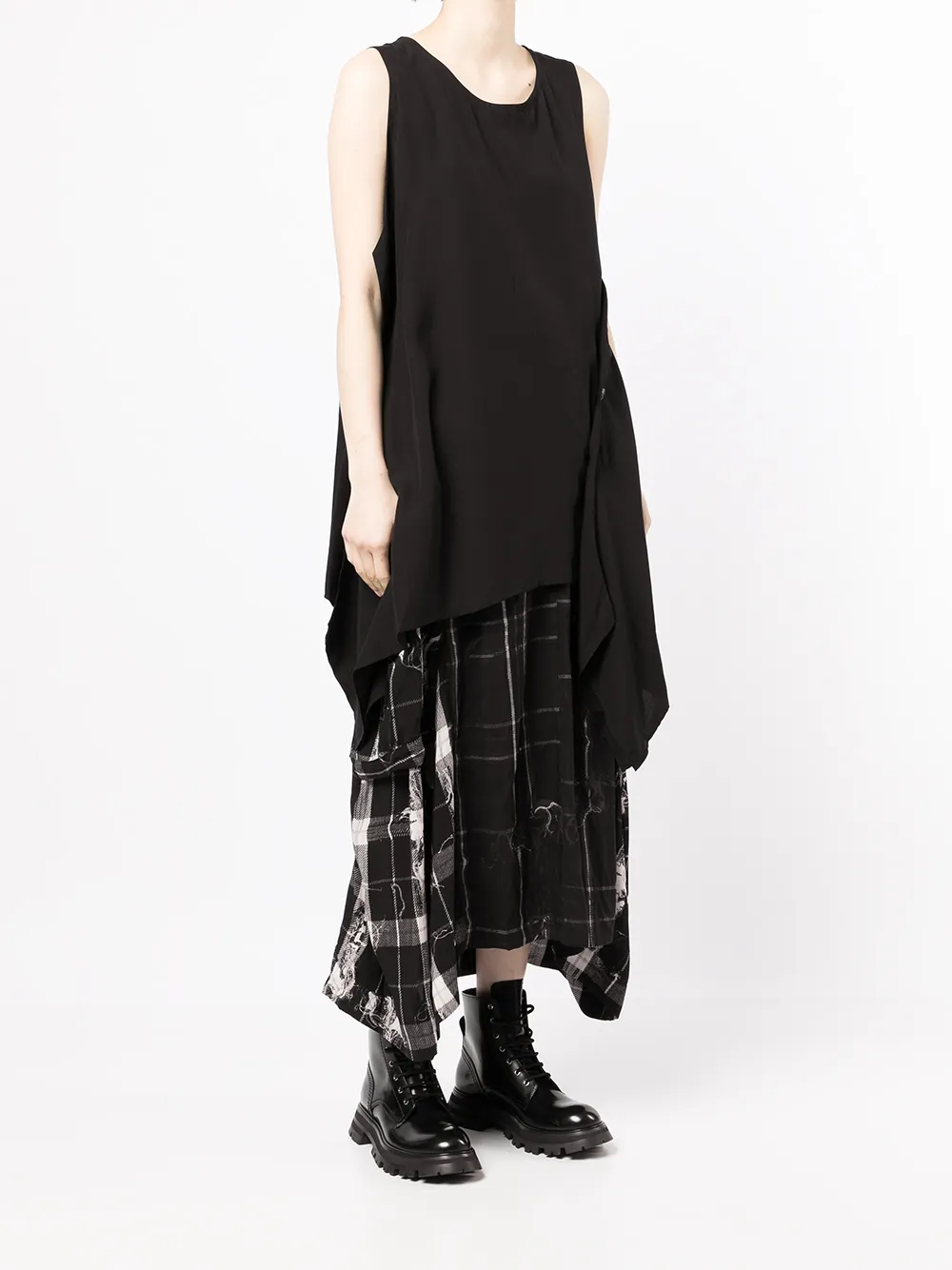 Круглый вырез, без рукавов, драпировка и неравномерный подол. Цвет: черный.