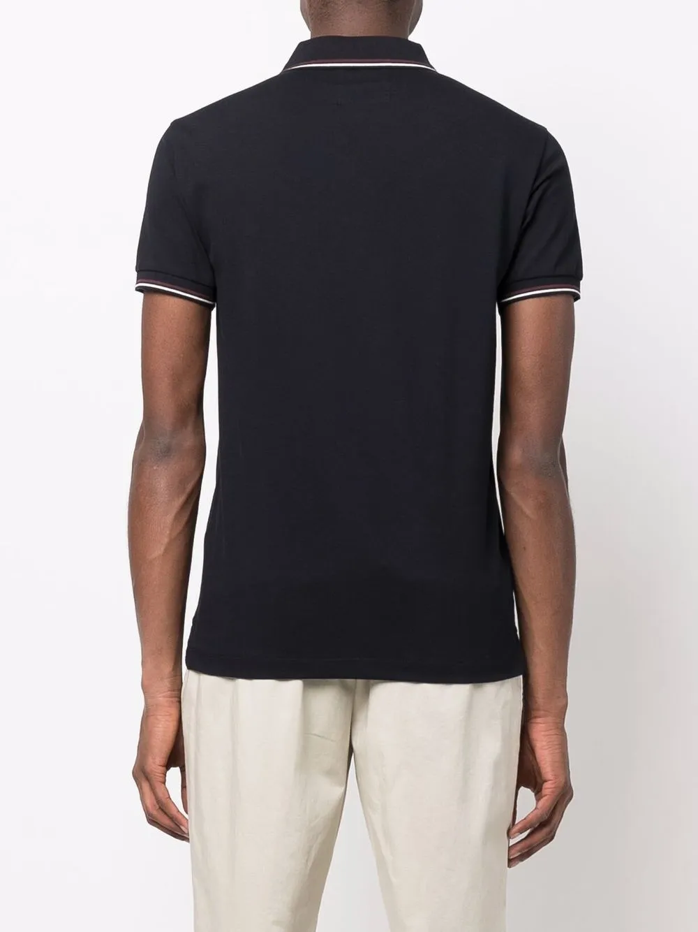 Вышитый логотип на груди, отделка в полоску, классический воротник, застежка на пуговицах спереди и короткие рукава.