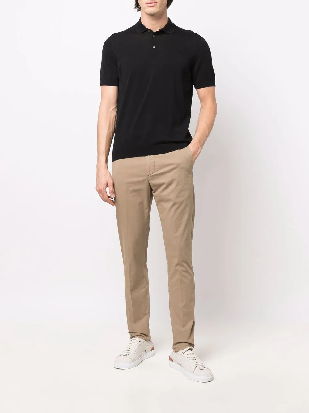 Воротник поло, планка на пуговицах спереди, короткие рукава и прямой подол.
