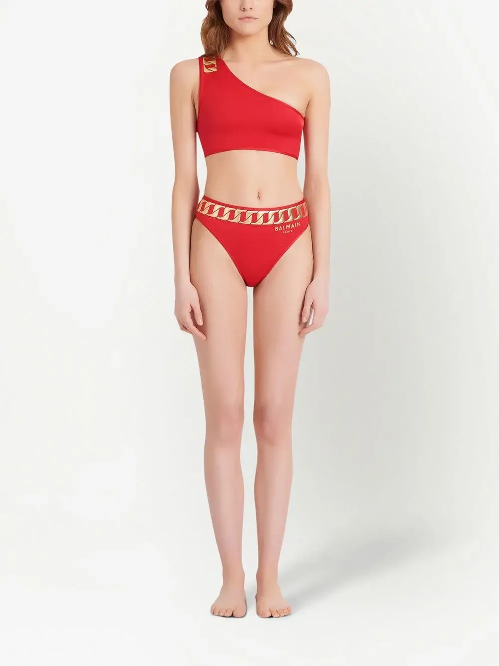 Ярко-красный, эластичный материал, цепочный принт, модель на одном плече, асимметричная форма, плавки бикини с завышенной талией и логотип спереди. Пожалуйста, примеряйте купальники и пляжные шорты только поверх собственного белья.