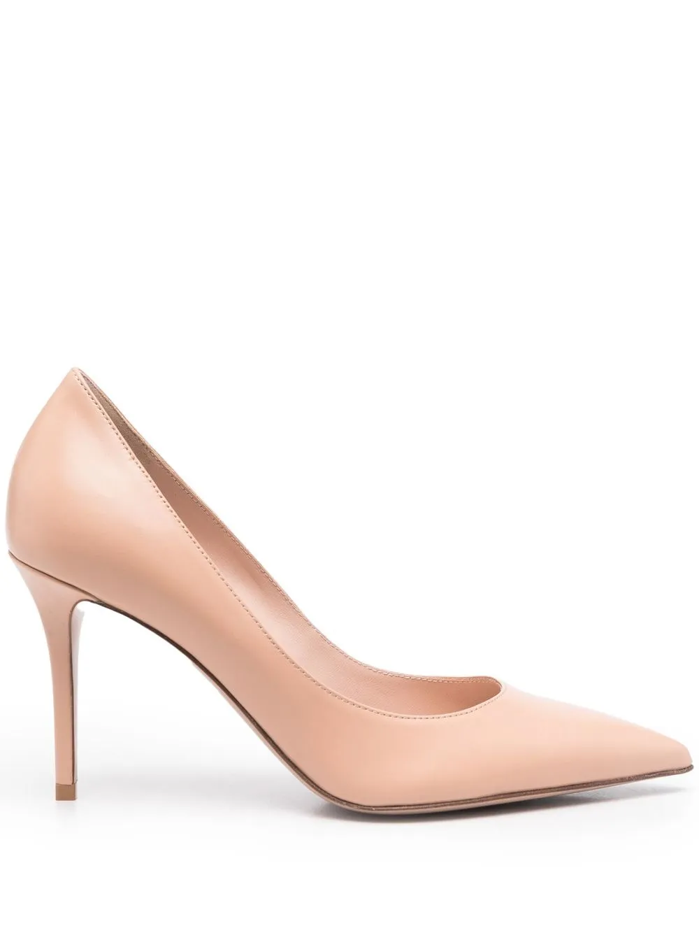 Светло-бежевый, козья кожа, стелька с логотипом, заостренный носок, модель без застежки и высокий каблук.
