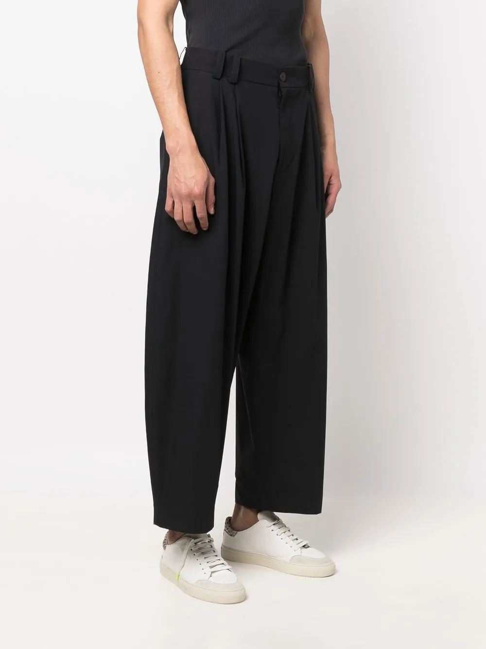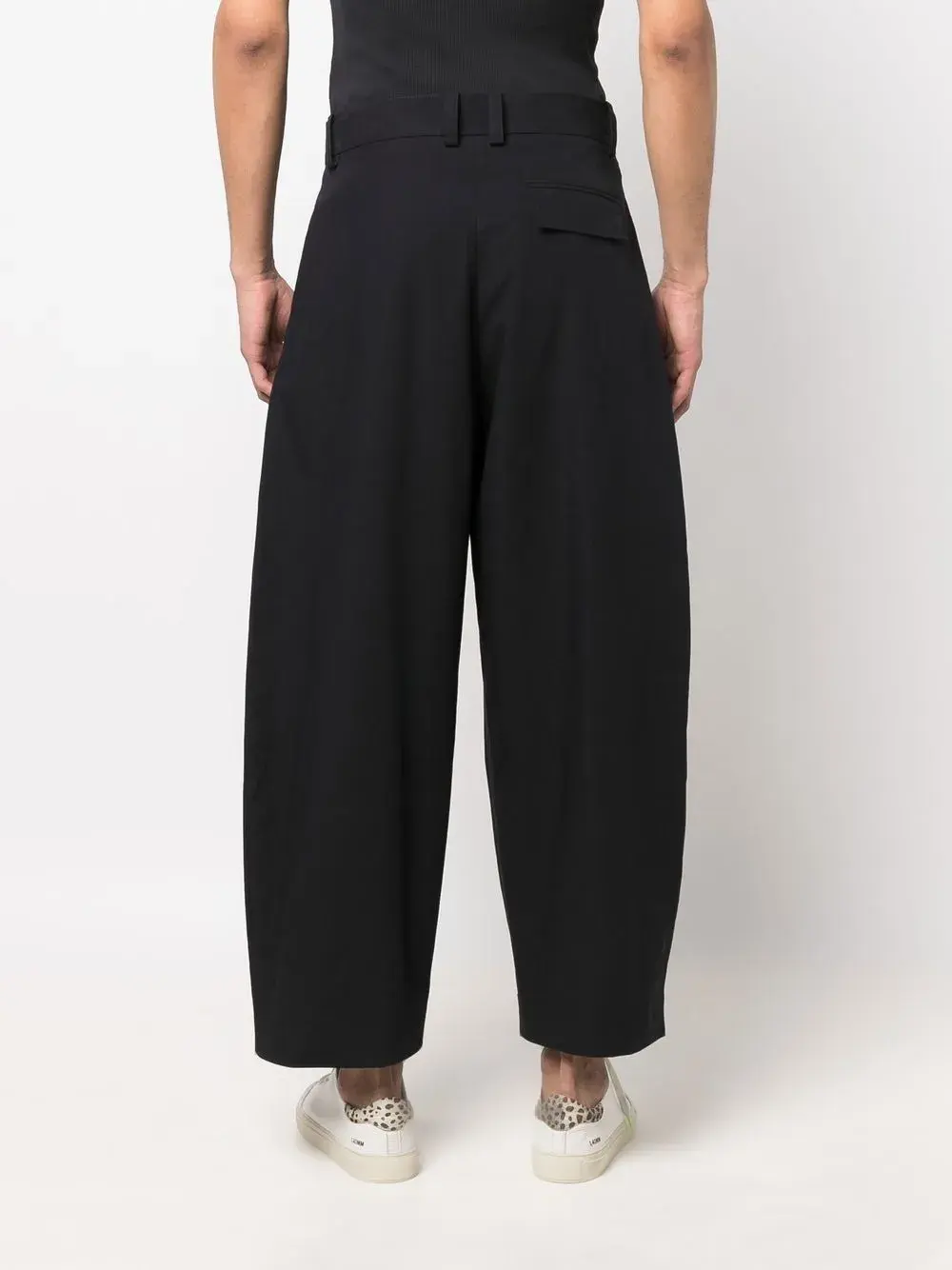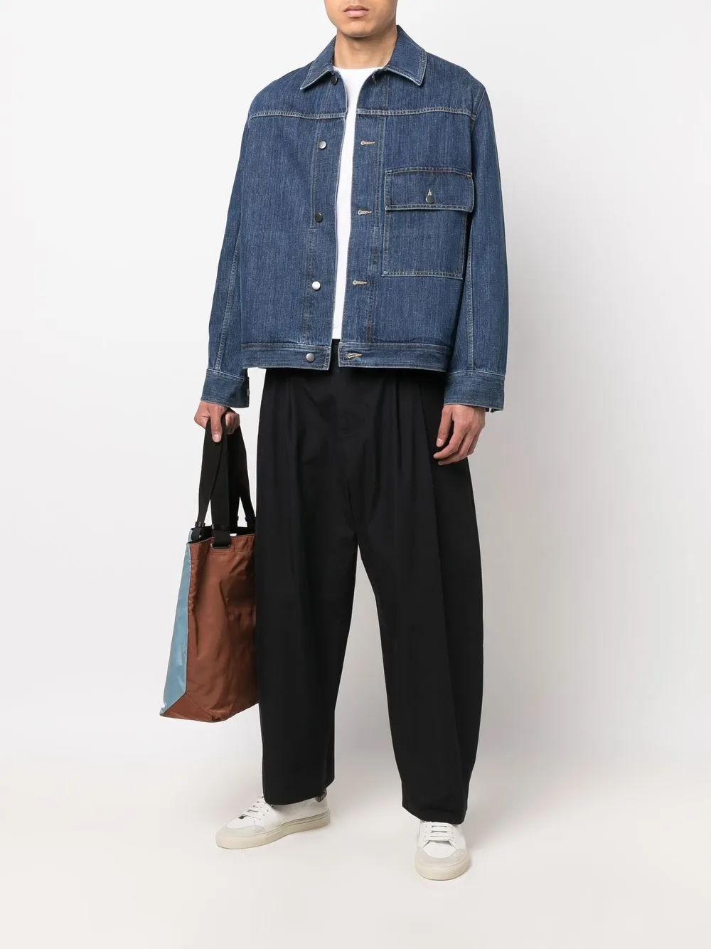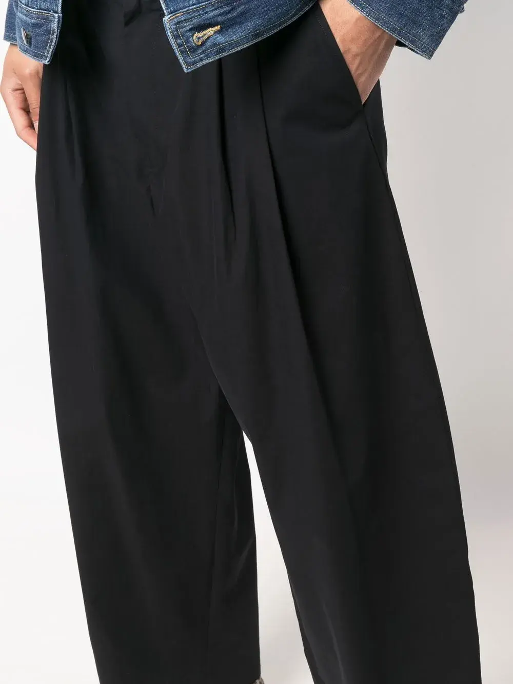 Хлопок, темно-синий, строгий крой, средняя посадка, свободный крой, низкий шаговый шов, прорезные карманы по бокам и карман с клапаном сзади.