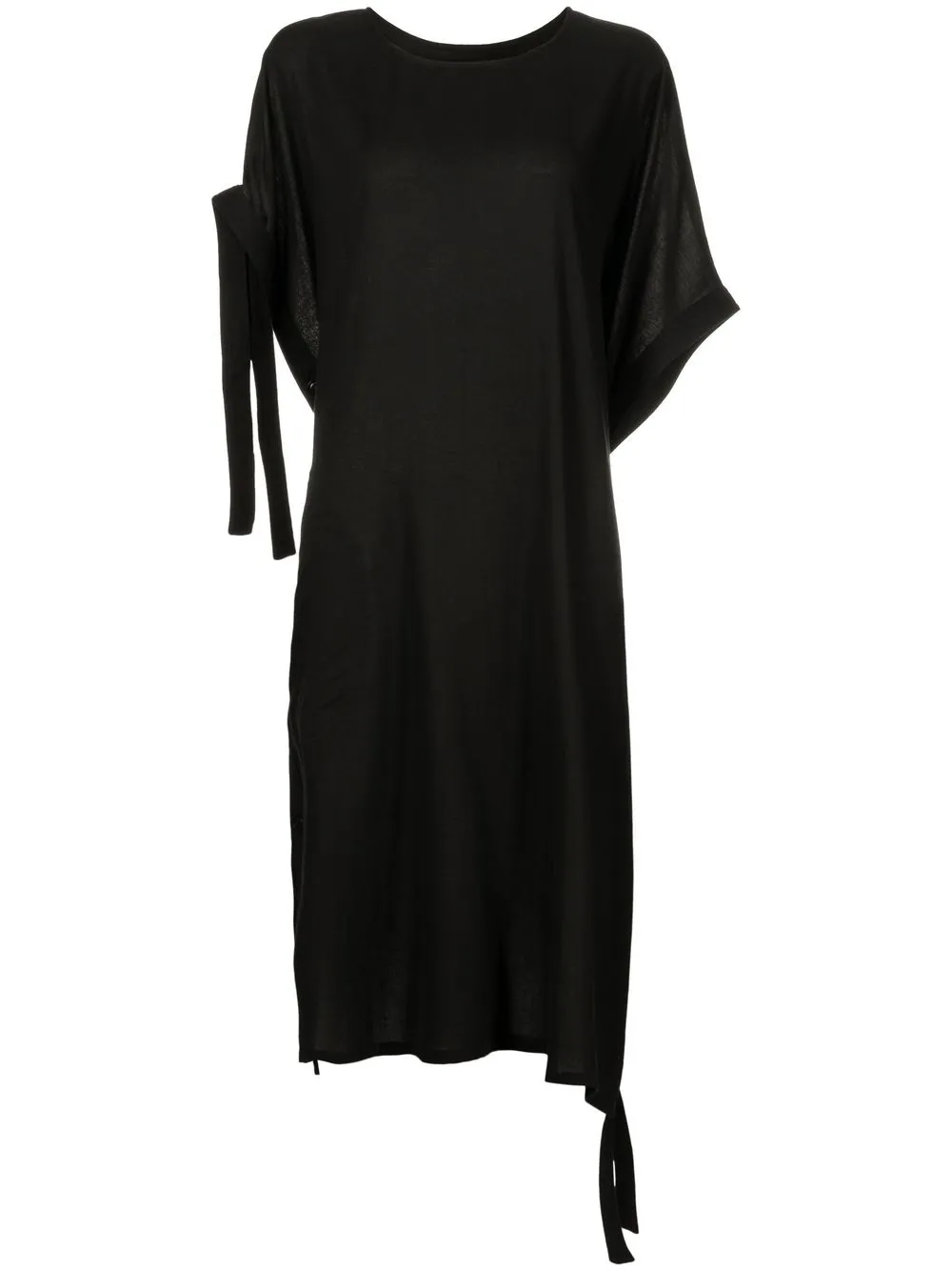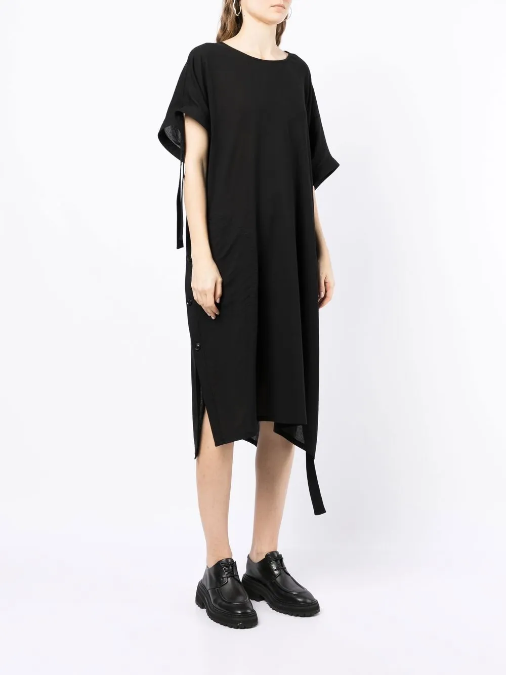 Черный, хлопок, ткань джерси, завязки по бокам, пуговичная застежка сбоку, круглый вырез, короткие рукава, прямой подол и длина миди.