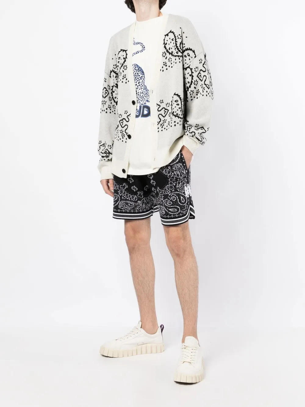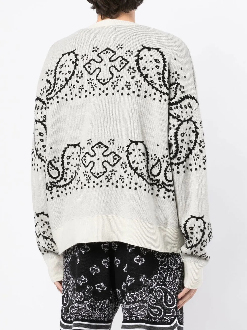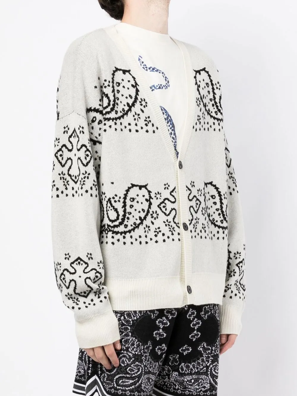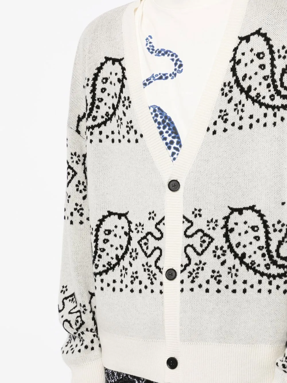 Светло-серый, черный, кремовый, смесь шерсти и кашемира, узор пейсли, V-образный вырез, застежка на пуговицах спереди и длинные рукава.