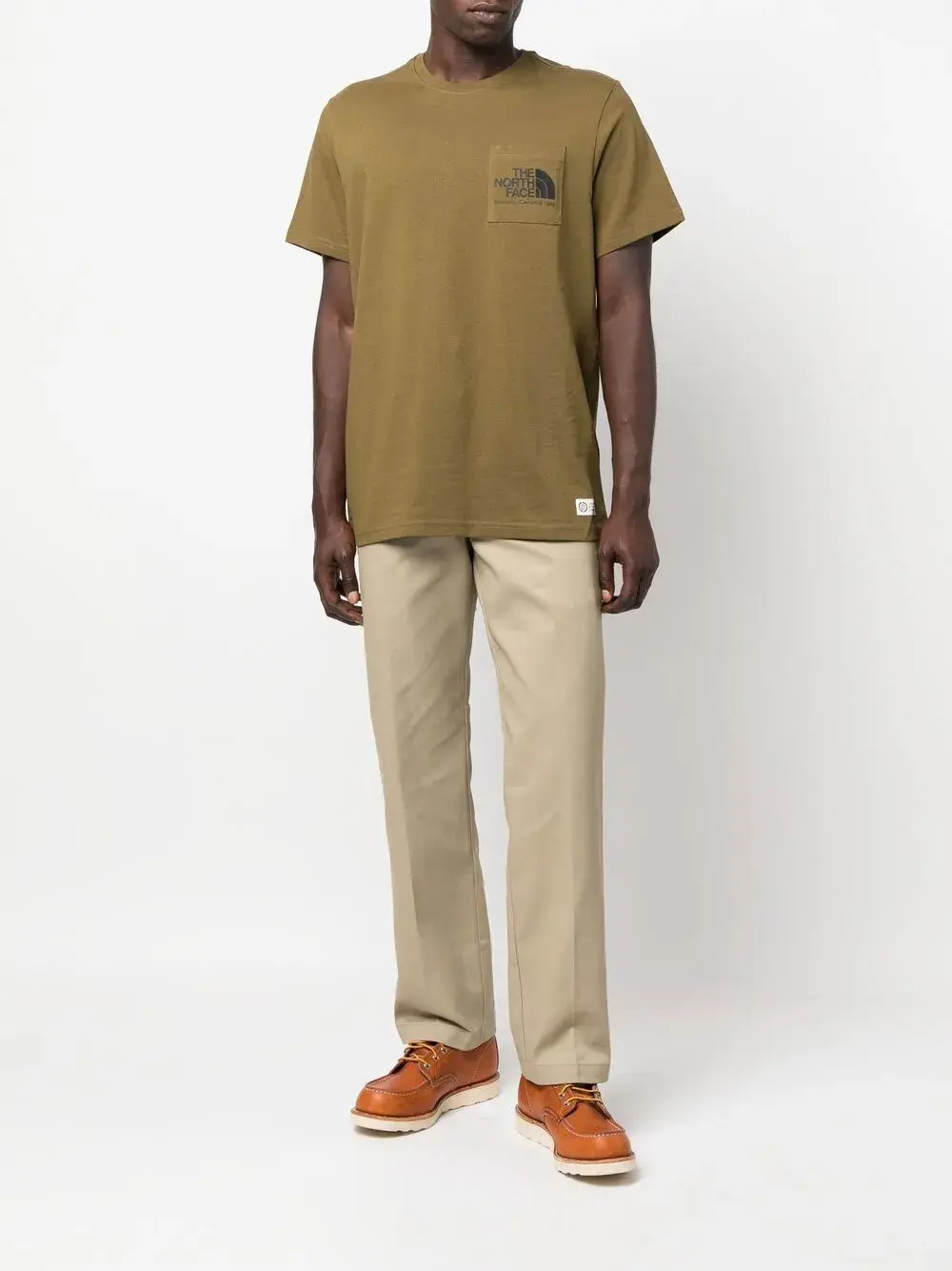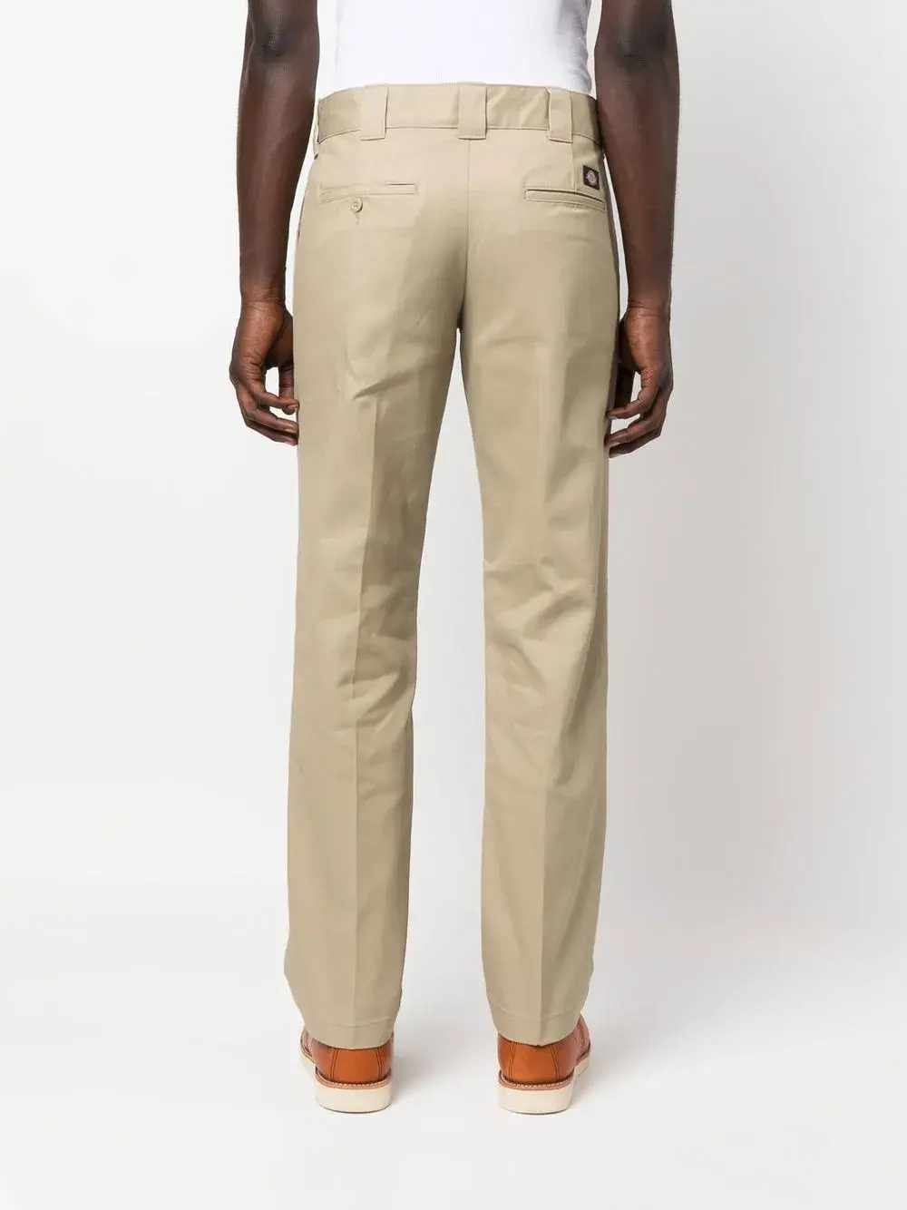 Хаки, смесовый хлопок, нашивка с логотипом сзади, прямой крой, потайная застежка спереди, петли для ремня и два кармана с листочкой сзади.