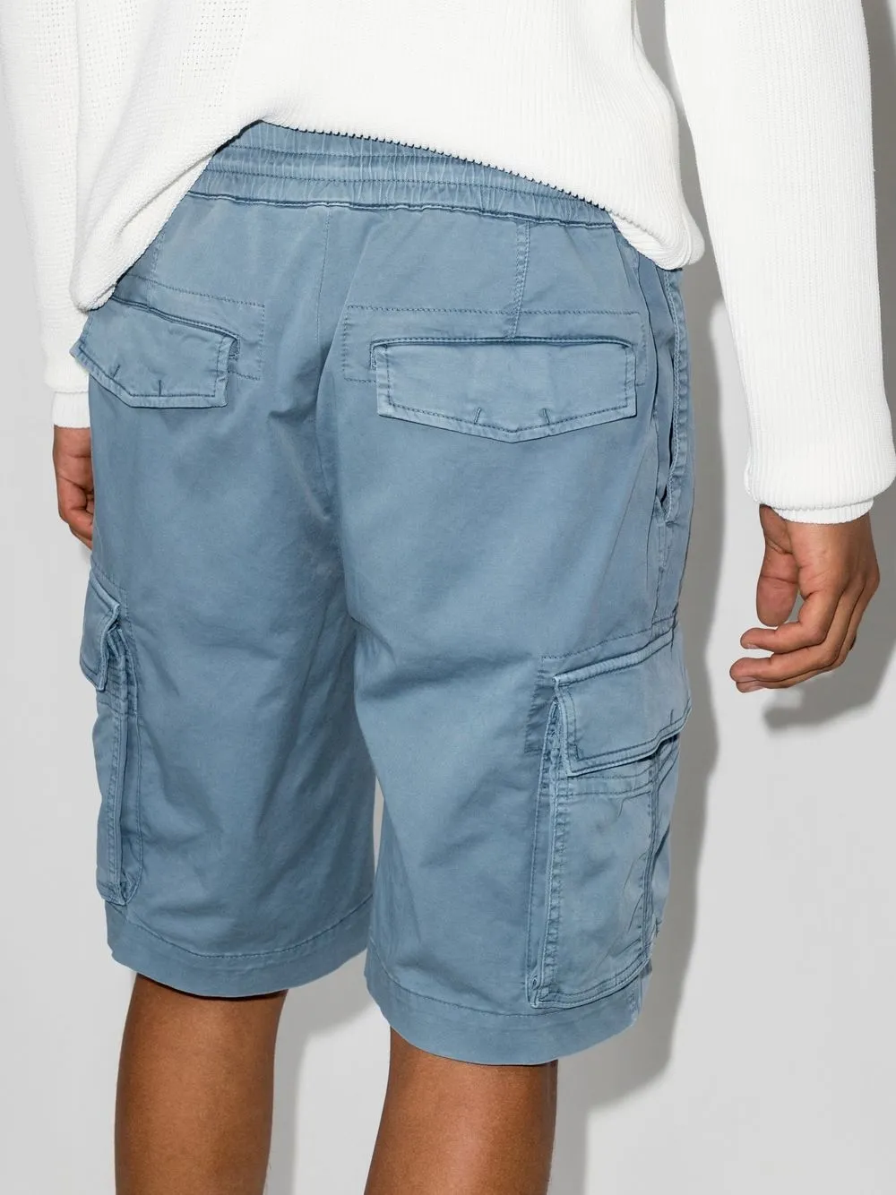 Синий, хлопок, окрашивание готовой вещи по технологии garment dye, кулиска на талии, два накладных кармана по бокам, два кармана с клапанами сзади и длина до бедер.