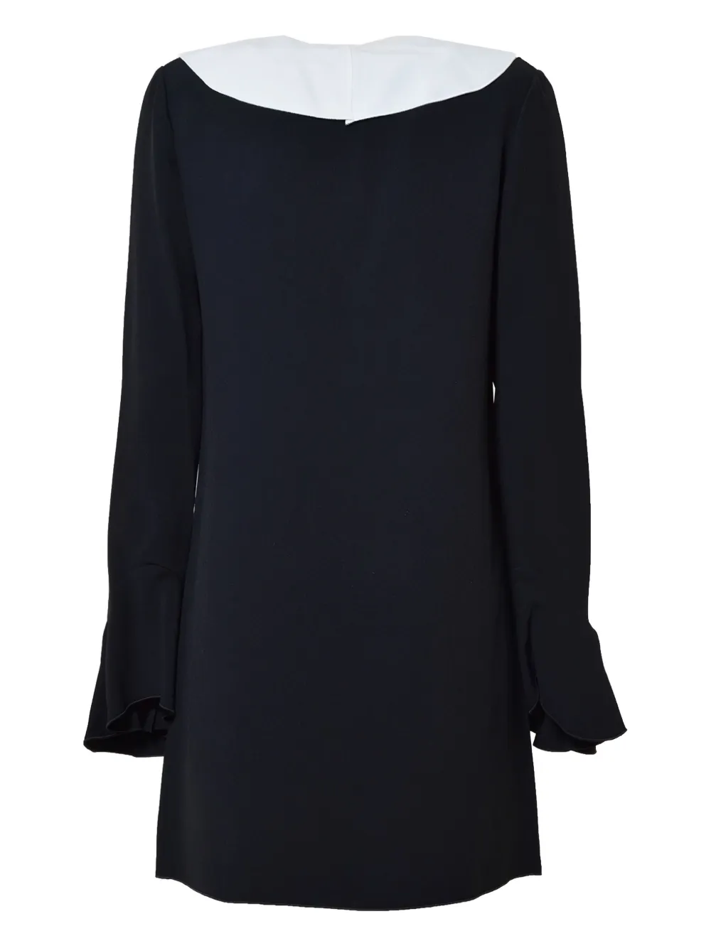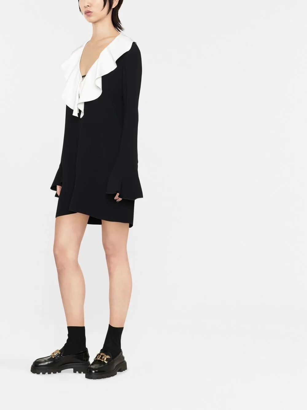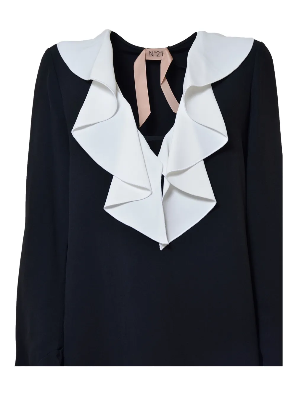Черный, белый, V-образный вырез, вставки с оборками и длинные рукава.
