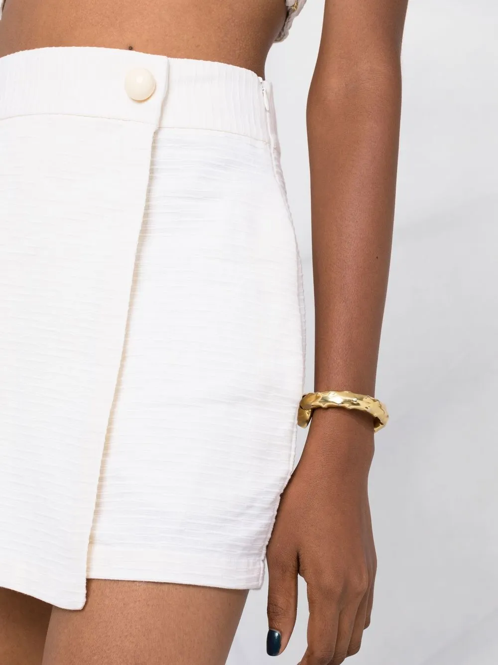 Белый, хлопок, завышенная талия, юбка с запахом, два вшитых кармана по бокам и застежка на пуговицах спереди.