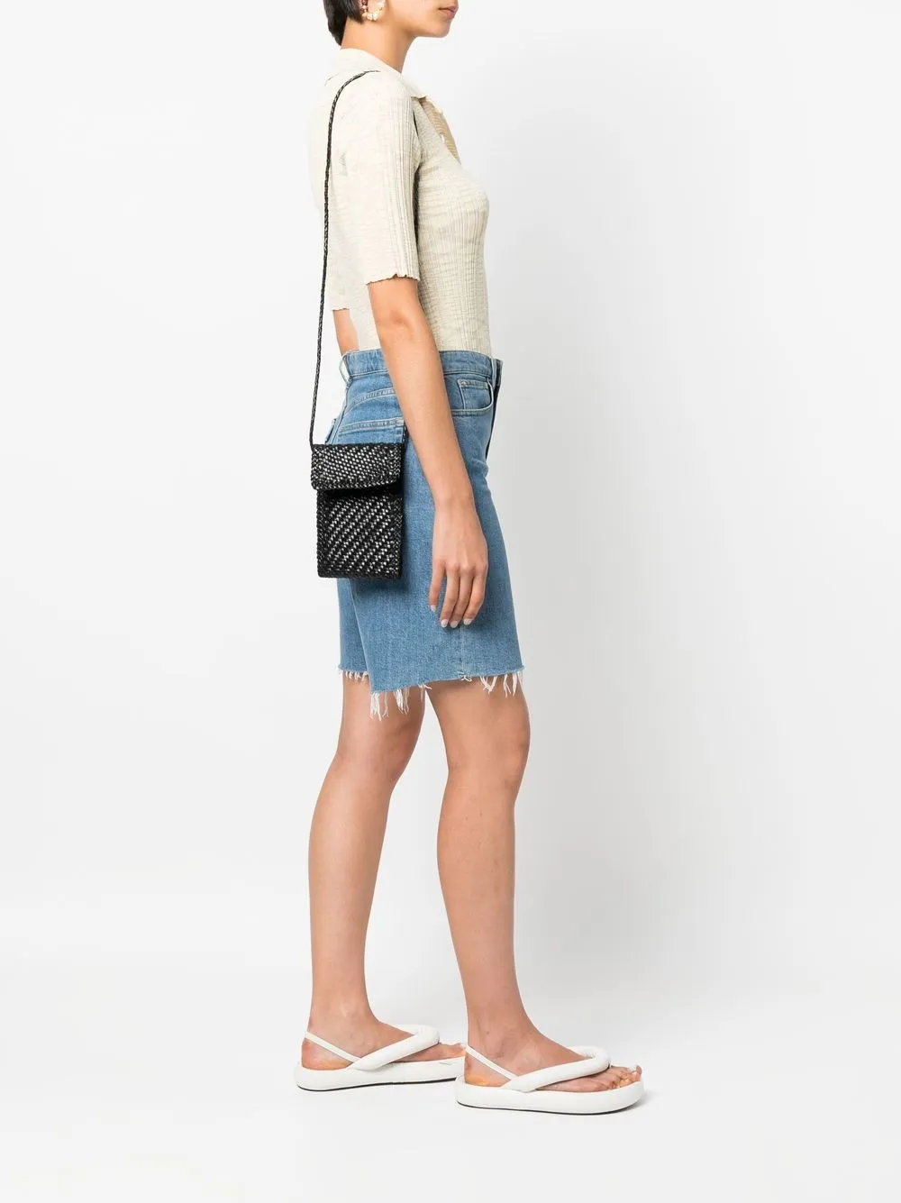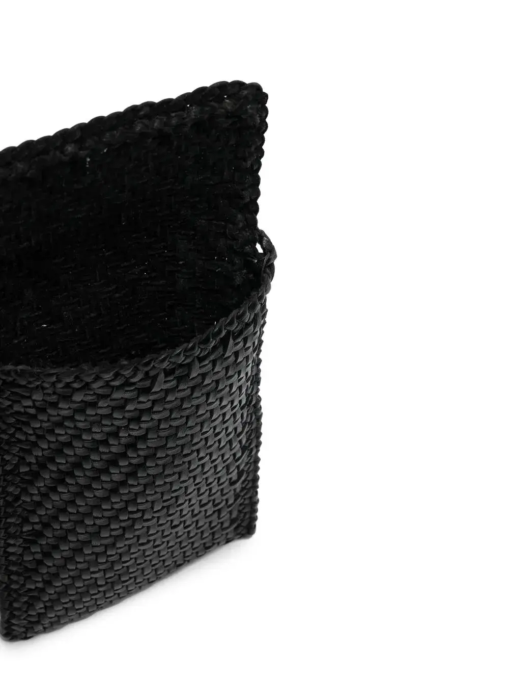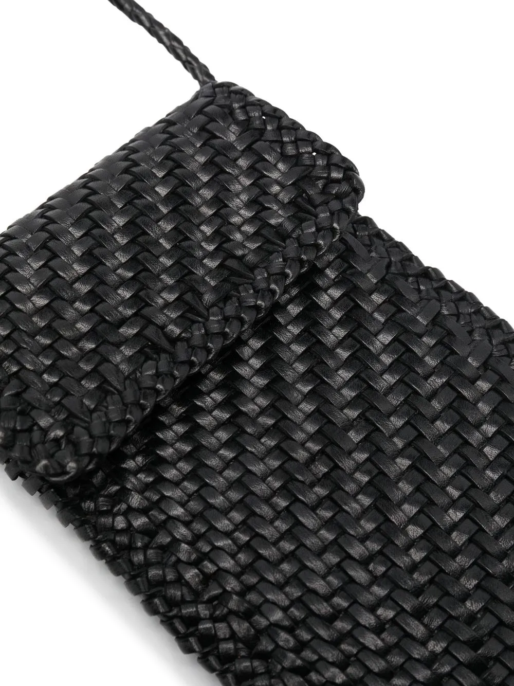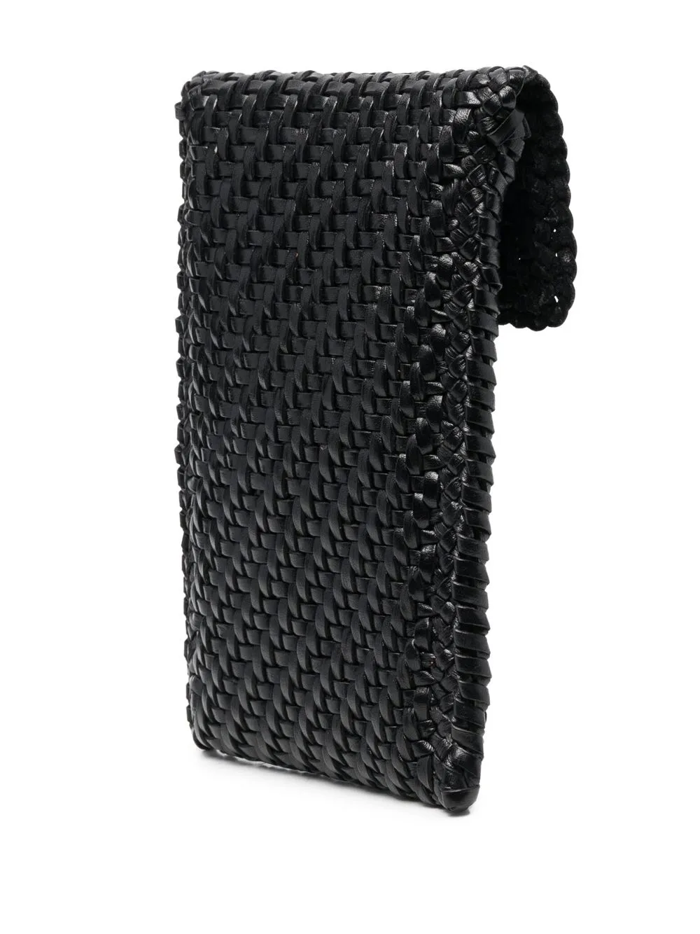 Черный, кожа, прямоугольная форма, переплетенный дизайн, откидной клапан и ремень на плечо.