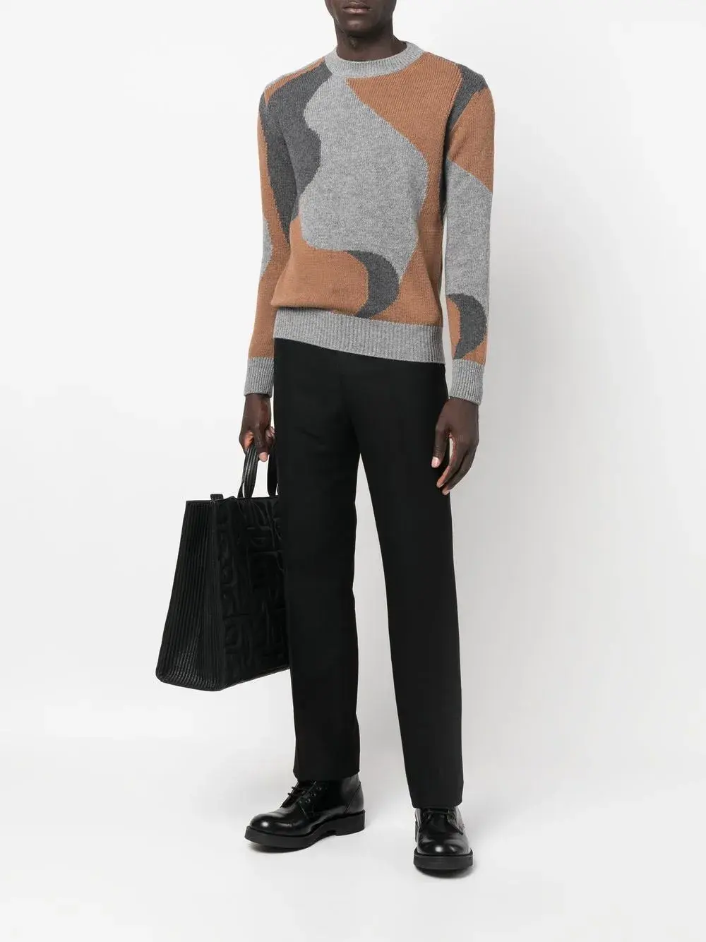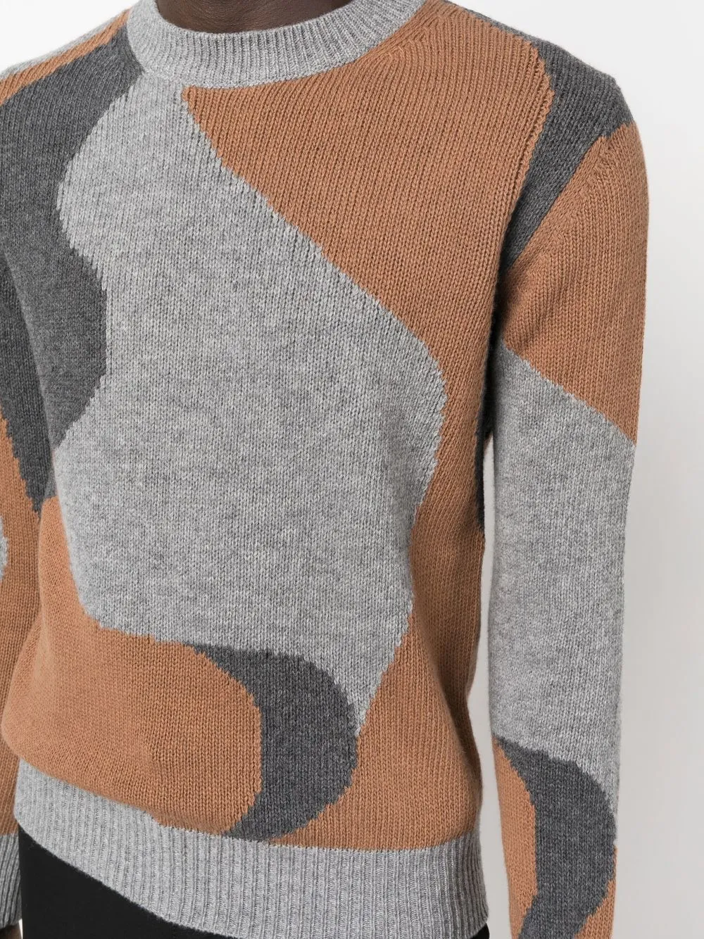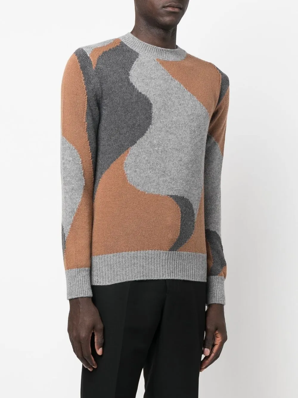 Расцветка Clay Orange, светло-серый, пепельно-серый, шерсть, абстрактный принт, трикотажный материал, круглый вырез, длинные рукава, манжеты в рубчик и подол в рубчик.