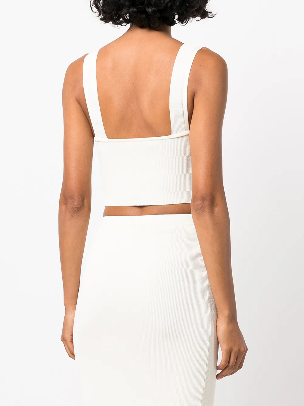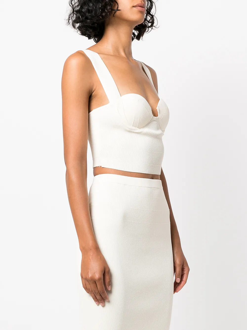 Цвет слоновой кости, вязаные края в рубчик, лиф в стиле бюстье, без рукавов и укороченная длина.