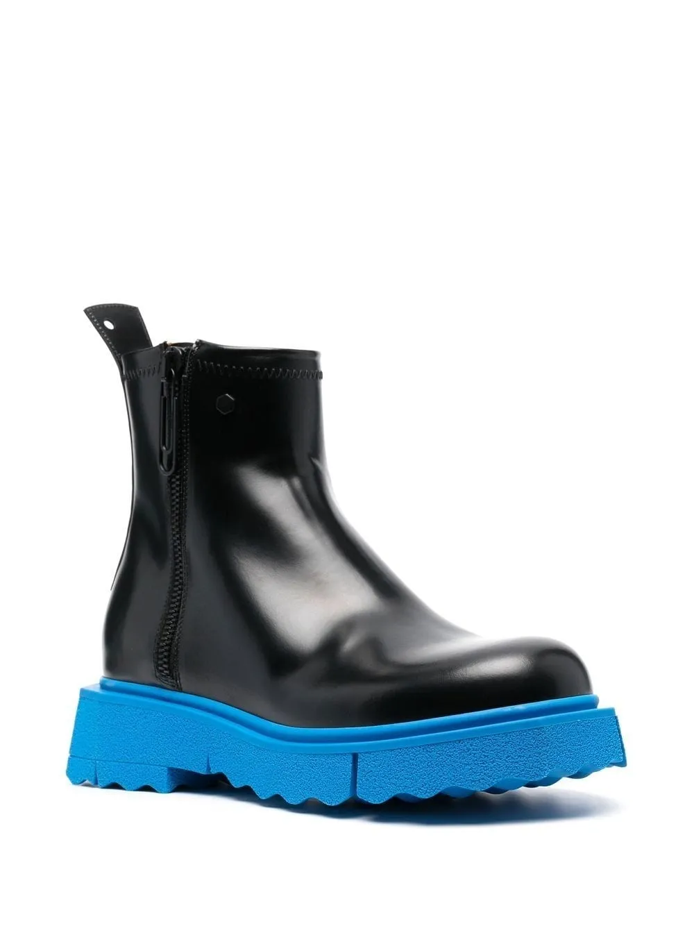 Черный/синий, телячья кожа, декор в виде скрепки, закругленный носок, застежка на молнии сбоку, стелька с логотипом, высота по щиколотку и знаковая подошва с эффектом губки.