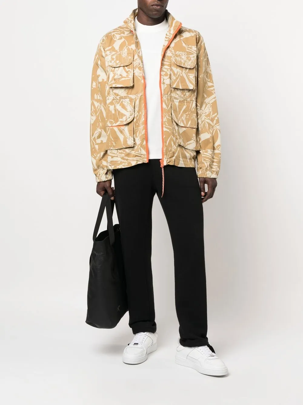 Песочно-бежевый, кремовый, хлопок, ткань с твиловым переплетением, камуфляжный принт, съемный капюшон, длинные рукава, застежка на молнии спереди, накладные карманы и светоотражающие детали.