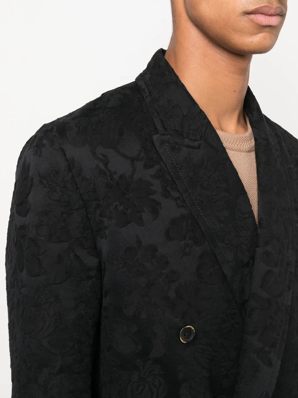 Черный, бархатный эффект, заостренные лацканы, двубортная застежка на кнопки, длинные рукава, манжеты на пуговицах, прорезной карман на груди, два передних кармана с клапанами и длина миди.