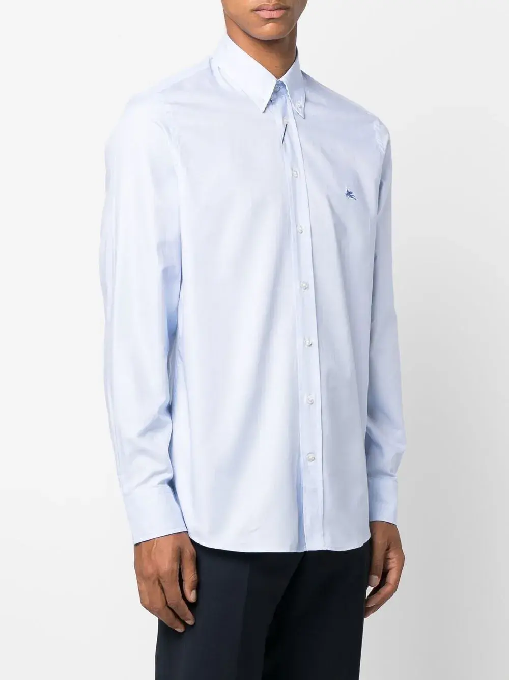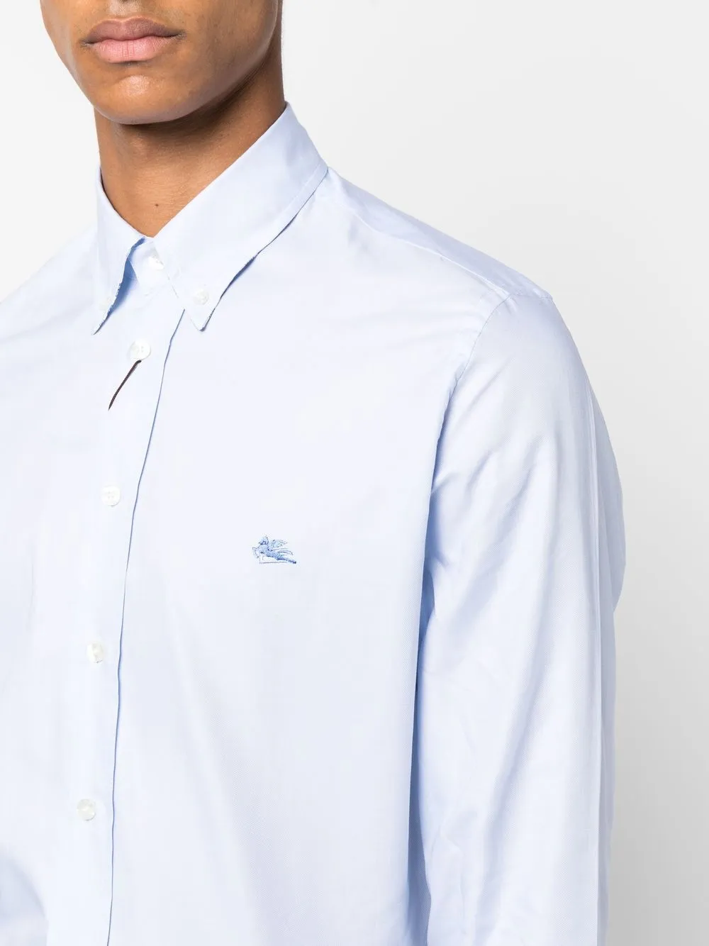 Голубой, хлопок, вышитый логотип на груди, узор Pegaso, воротник на пуговицах, застежка на пуговицах спереди, длинные рукава, манжеты на пуговицах и закругленный подол.