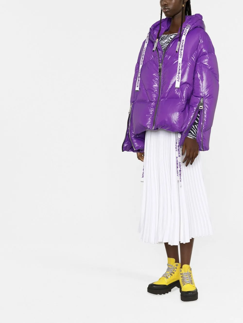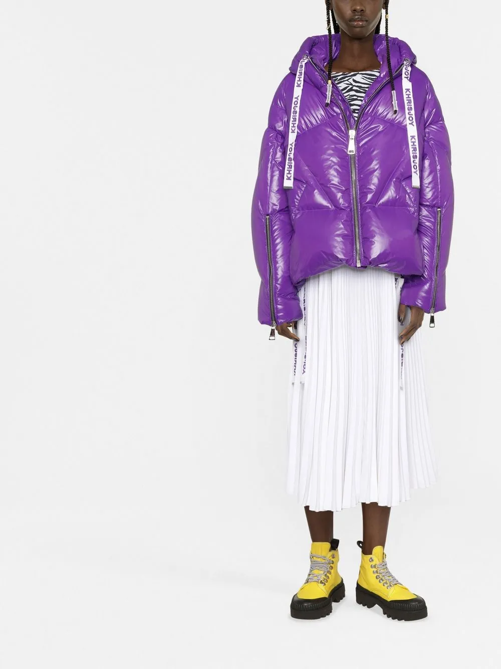 Фиолетовый, шнурок с логотипом, глянцевая фактура, наполнитель из смеси пуха и пера, затягивающийся на шнурок капюшон, застежка на молнии спереди, два прорезных кармана по бокам и длинные рукава.