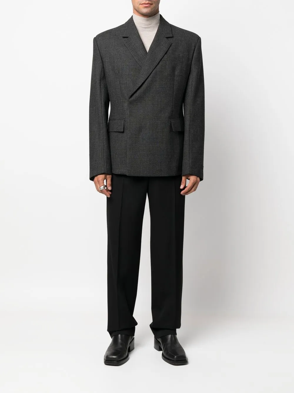 Антрацитово-серый, необработанная шерсть, зазубренные лацканы, двубортная застежка на кнопки, длинные рукава и два кармана с клапанами по бокам.