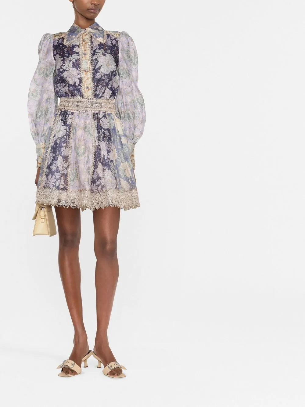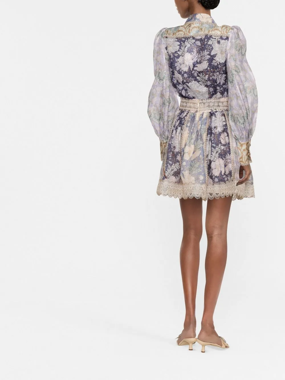 Фиолетовый, разноцветный, смесь льна и шелка, хлопок, сплошной цветочный принт, вставки из кружева, завышенная талия, потайная застежка сзади и длина до бедер.