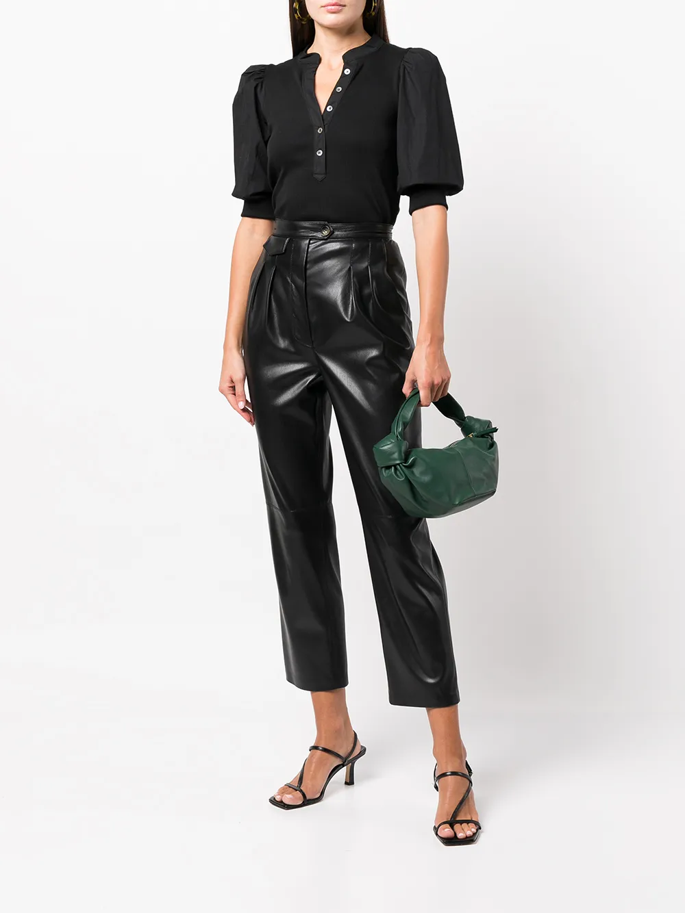 Черный, смесовый хлопок, V-образный вырез, застежка на пуговицы и короткие объемные рукава.