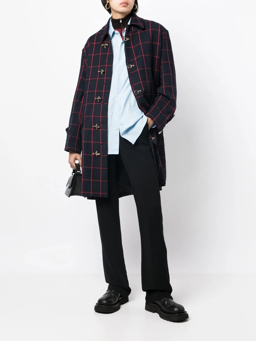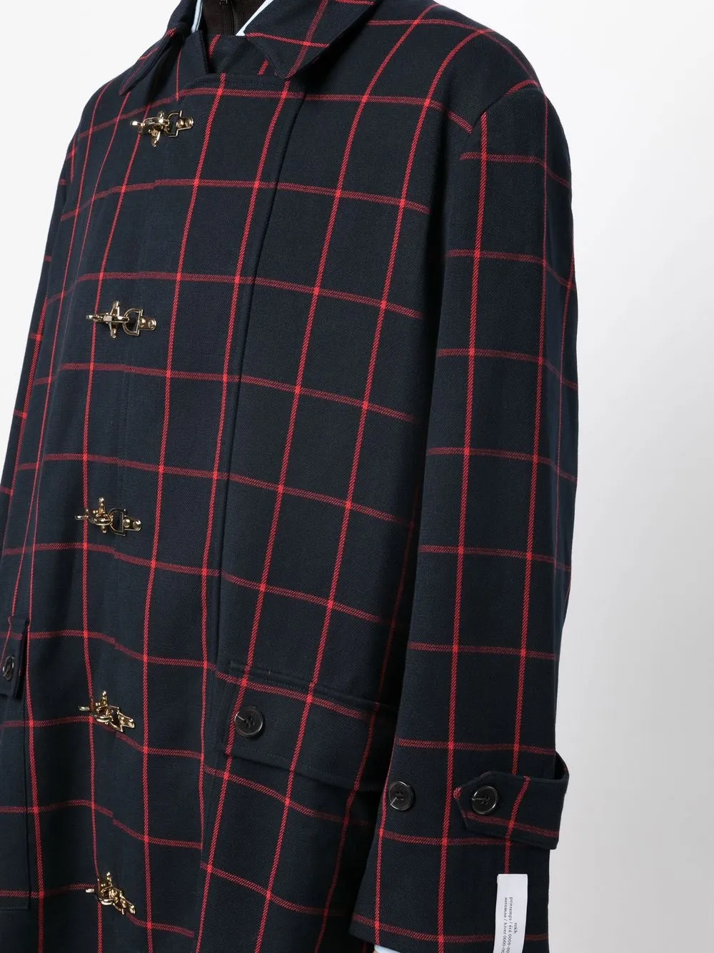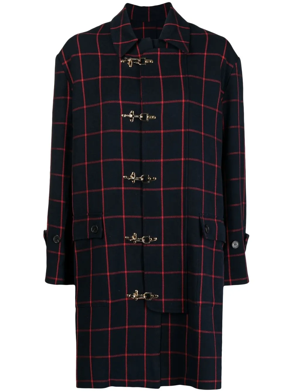 Темно-синий, красный, клетчатый узор, классический воротник, длинные рукава и длина миди.