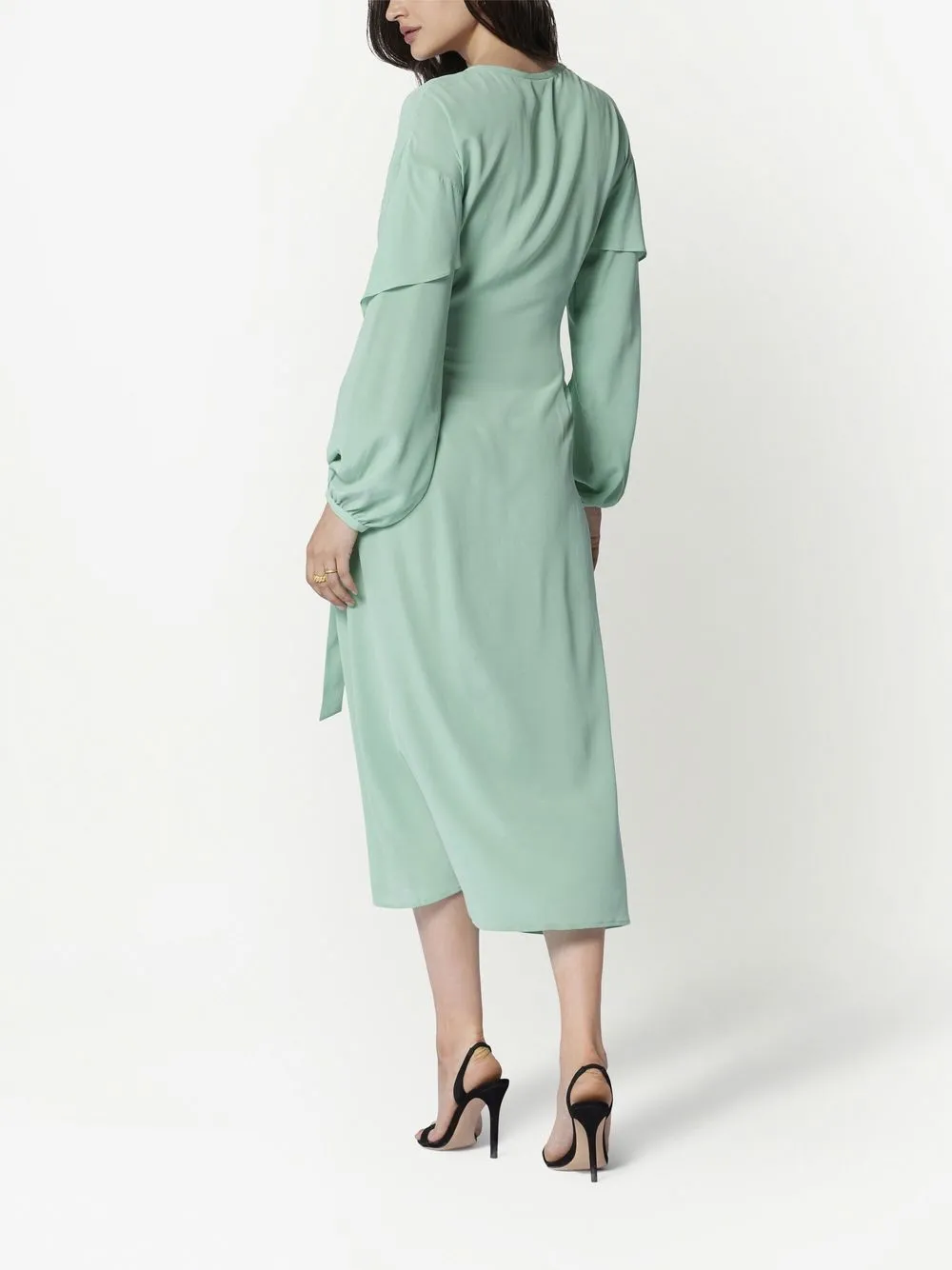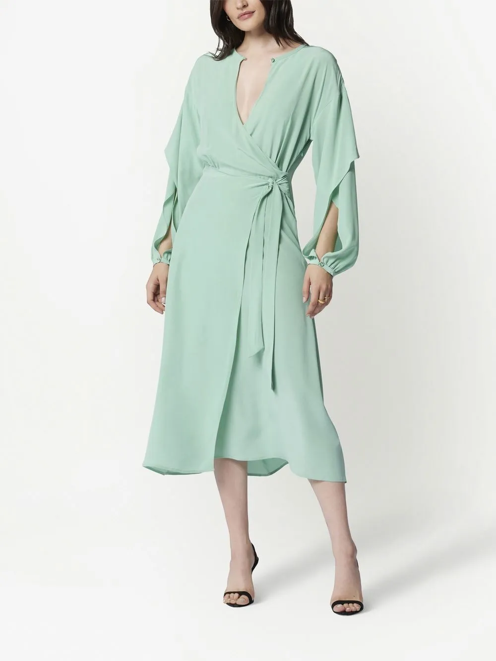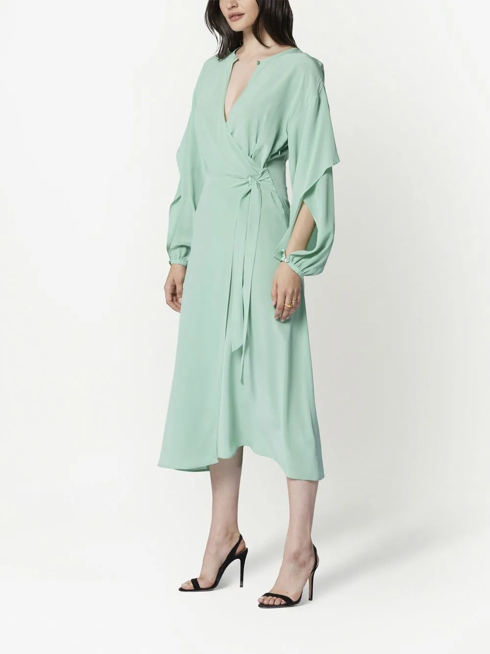 Светло-зеленый, шелк, глубокий V-образный вырез, модель на запах, длинные рукава, рукава с узкими манжетами и длина миди.