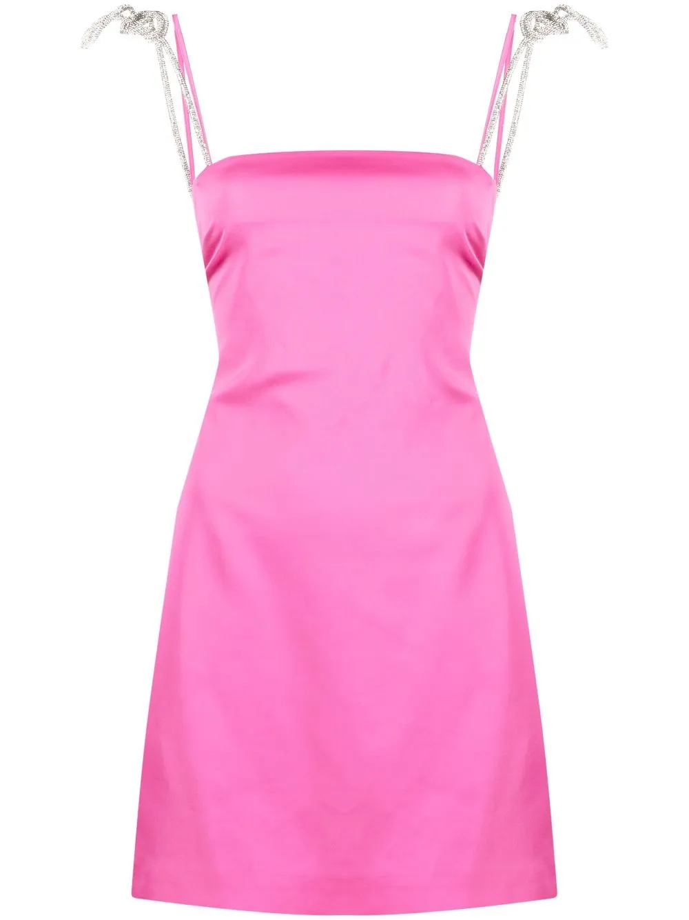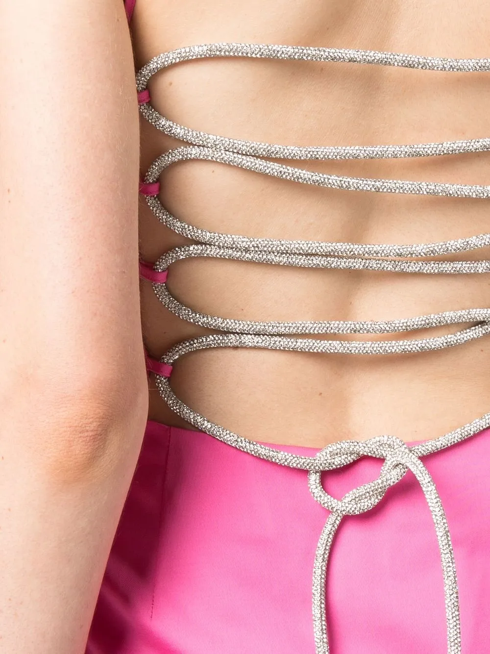 Розовый, декор из кристаллов, квадратный вырез, застежка на завязке сзади, без рукавов и приталенный силуэт.