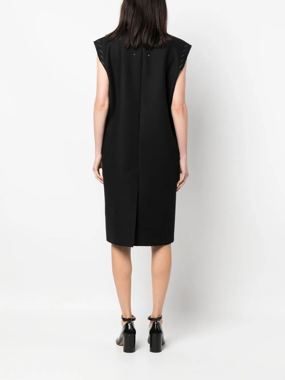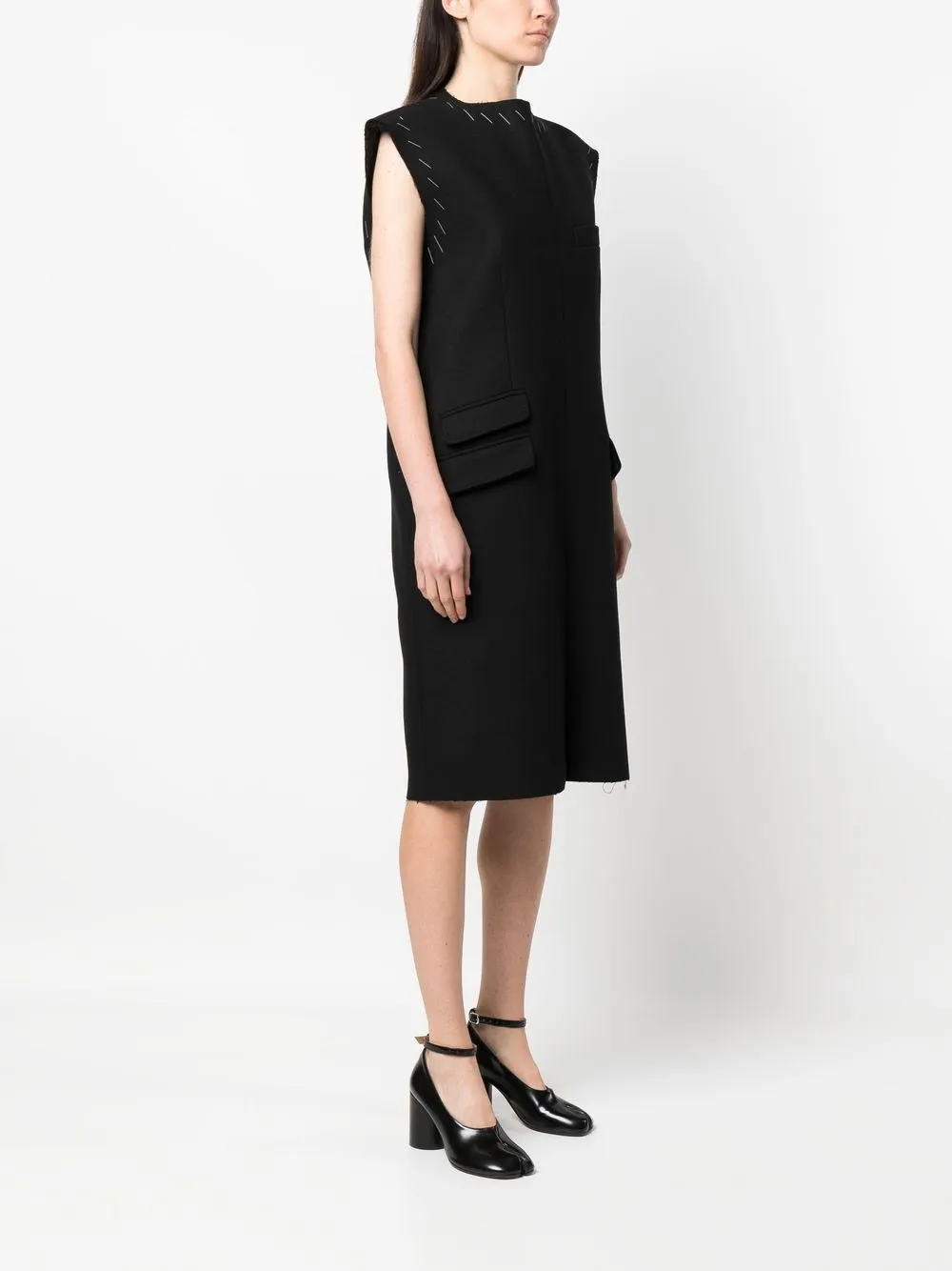 Черный, необработанная шерсть, хлопок, нашивка с логотипом, контрастная строчка, круглый вырез, прорезной карман на груди, без рукавов, прямой подол, вырез сзади и длина по колено.