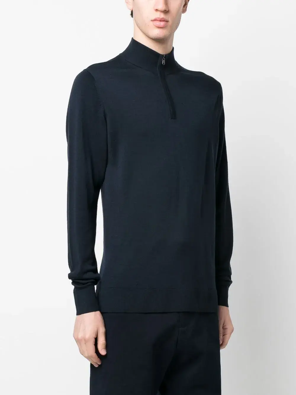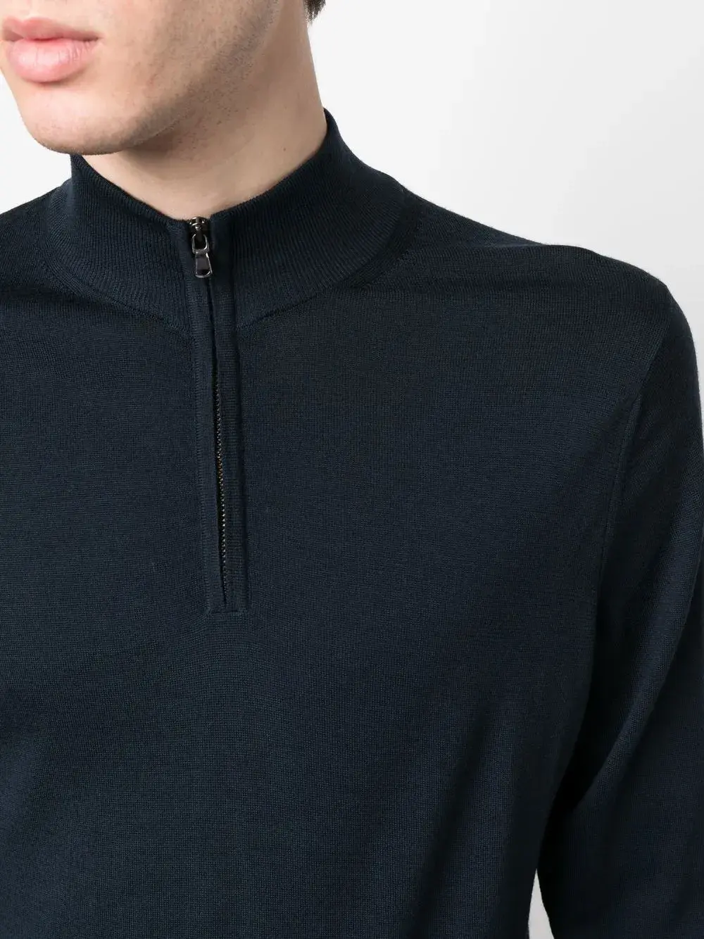 Темно-синий, шерсть мериноса, тонкая вязка, вязаные края в рубчик, высокий воротник, короткая застежка на молнии спереди, длинные рукава и прямой подол.