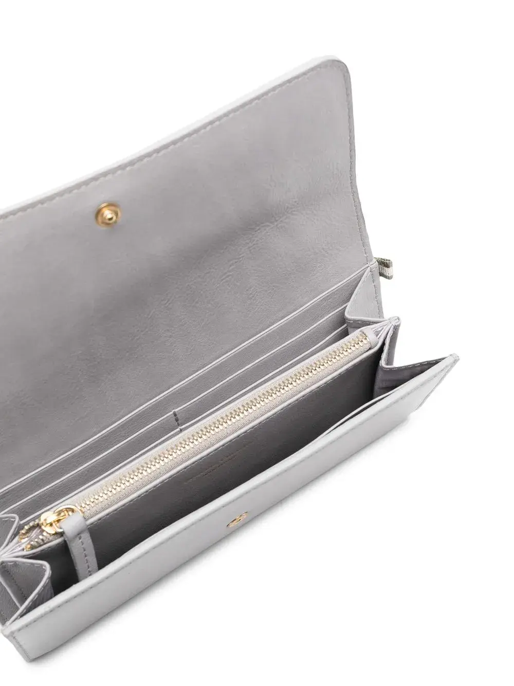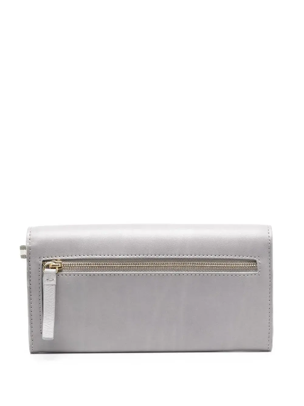 Светло-серый, телячья кожа, гладкая текстура кожи, прямоугольная форма, золотистый логотип, откидной верх с застежкой на кнопки, карман на молнии сзади, внутренний карман на молнии и внутренние отделения для карт.