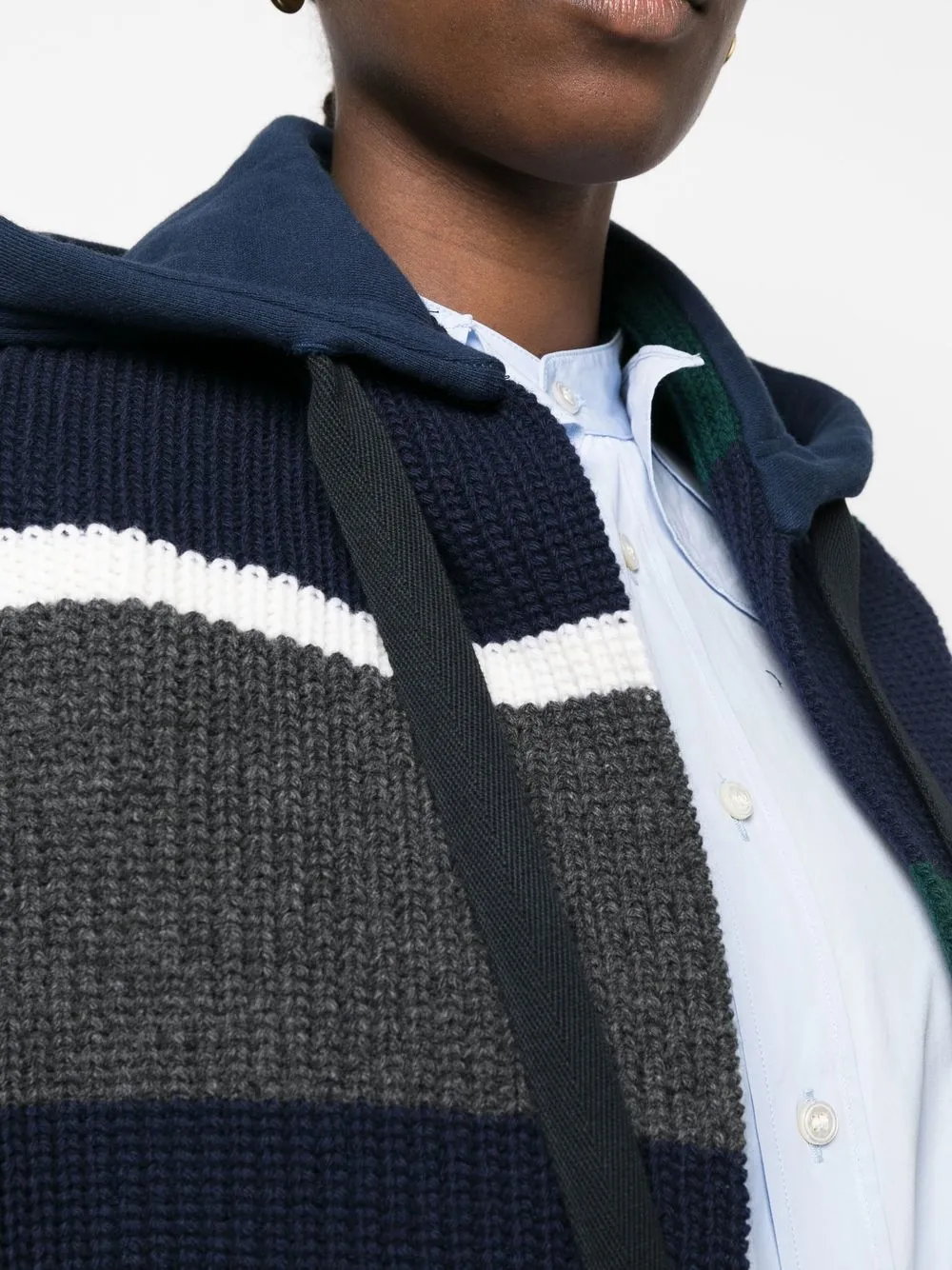 Темно-синий, угольно-серый, белый, оранжевый, необработанная шерсть, хлопок, узор в горизонтальную полоску, затягивающийся на шнурок капюшон и длинная модель.