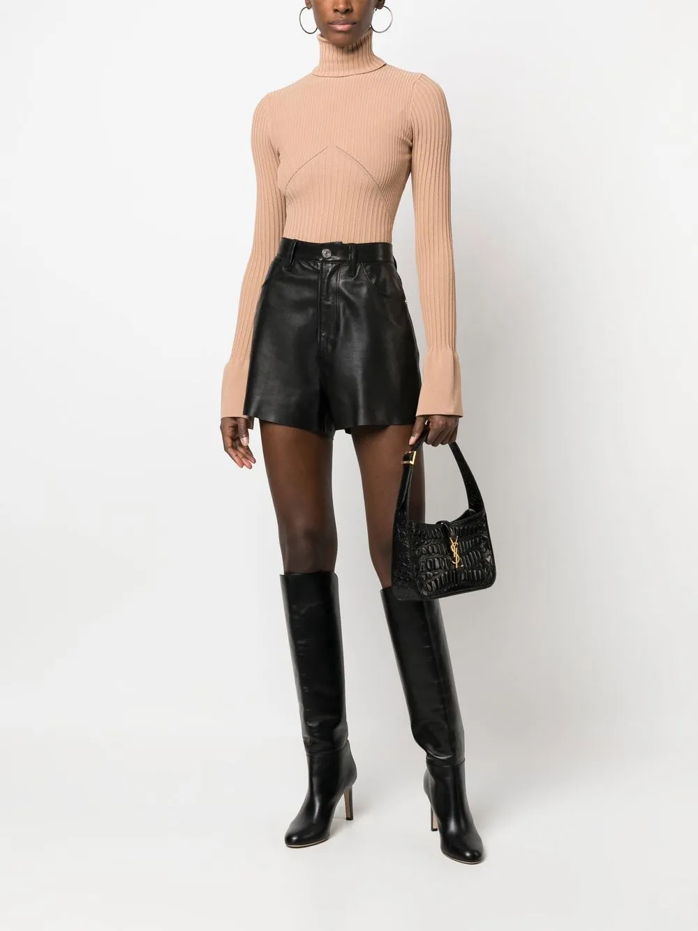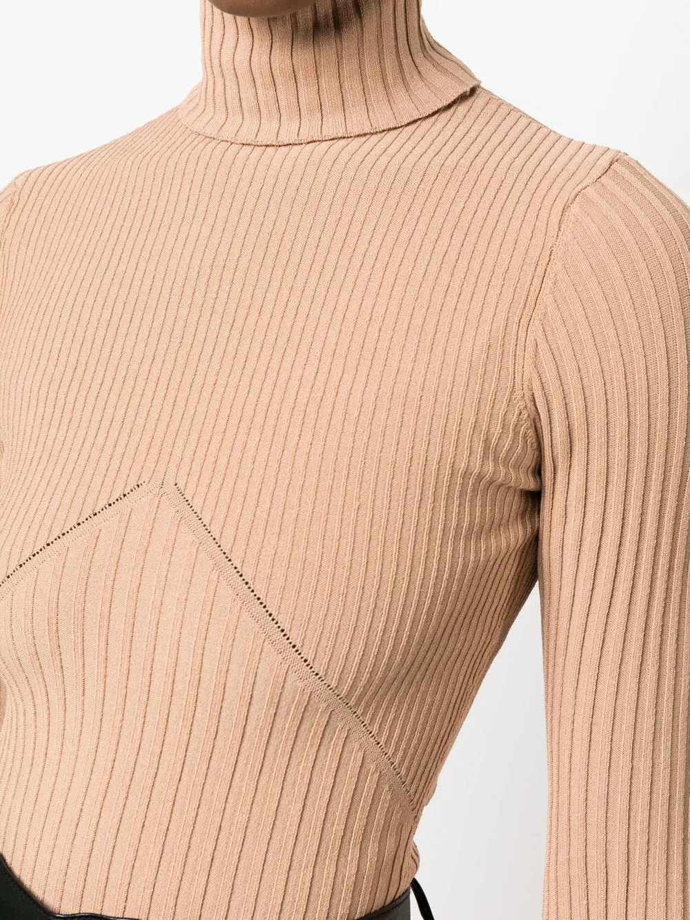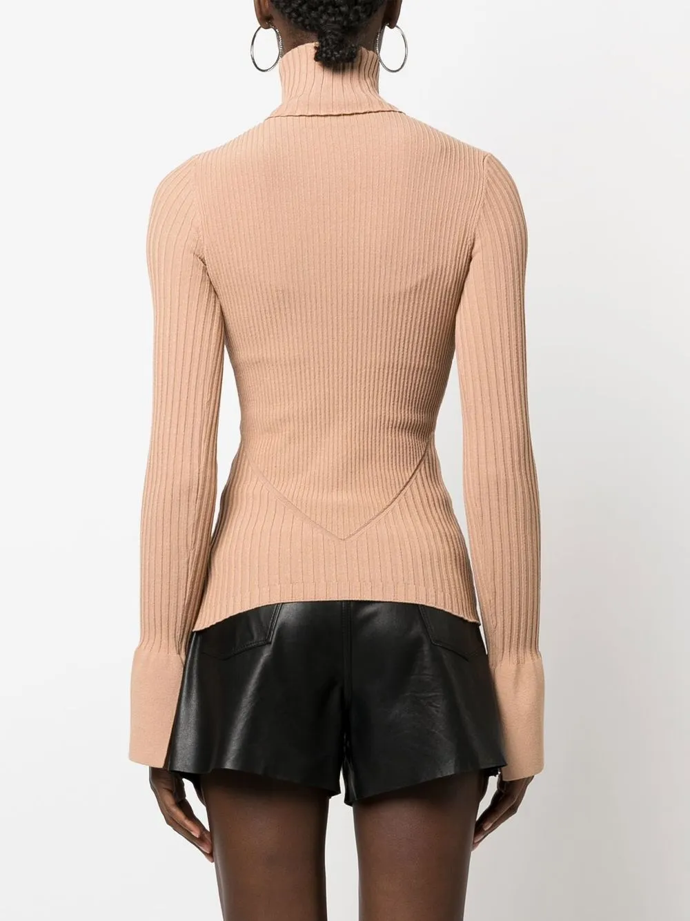 Бежевый, трикотаж в рубчик, строчка в тон, высокий воротник, длинные рукава и прямой подол.