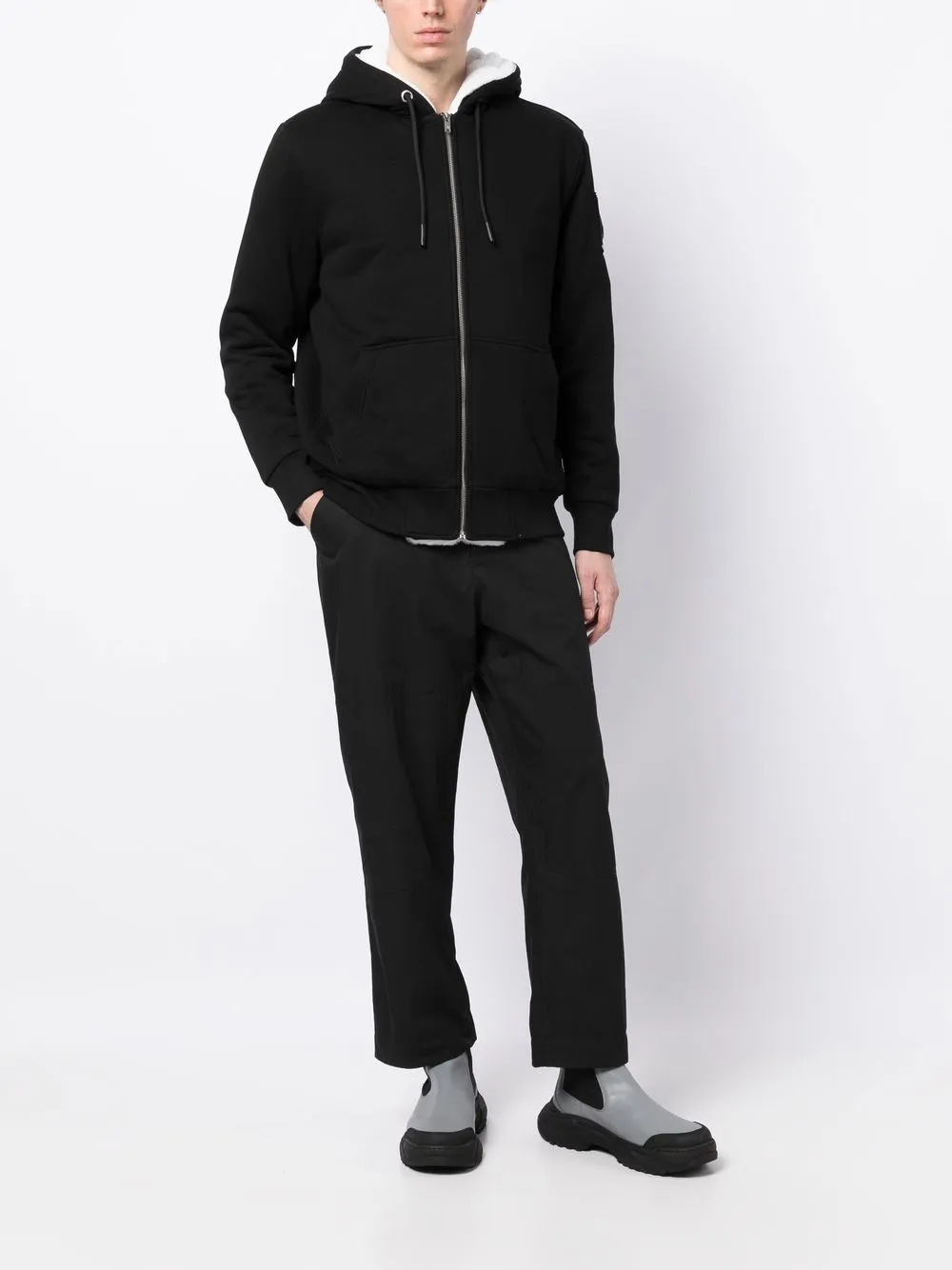 Смесовый хлопок, серебристый металлический логотип, классический капюшон, застежка на молнии спереди, длинные рукава и подол в рубчик.