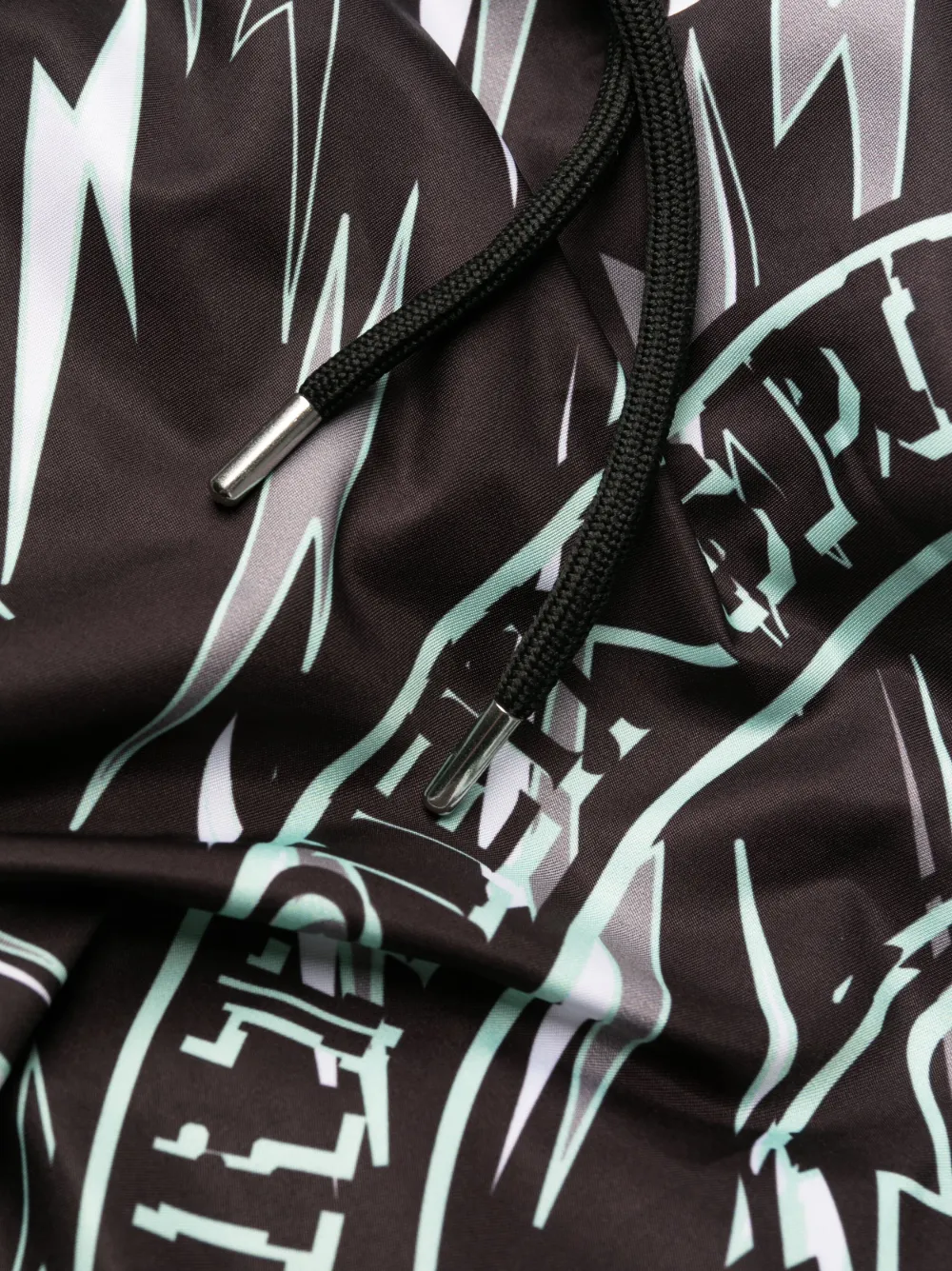 Черный, сплошной графичный принт, логотип сбоку, кулиска на талии и задние карманы с листочкой. Пожалуйста, примеряйте купальники и пляжные шорты только поверх собственного белья.