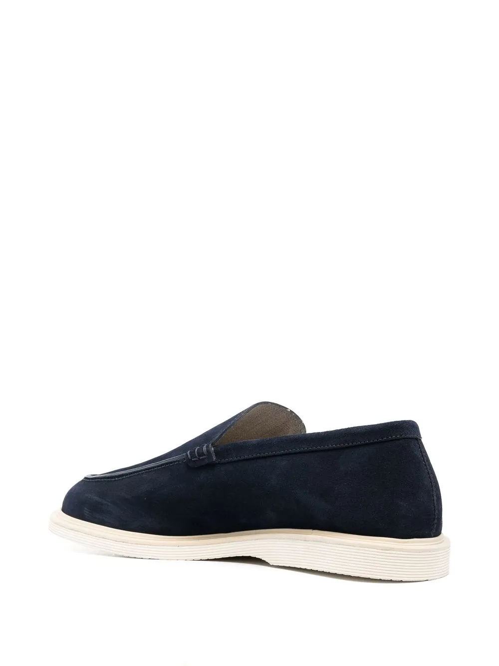 Темно-синий, замша из телячьей кожи, стелька с логотипом, миндалевидный носок, модель без застежки и плоская резиновая подошва.