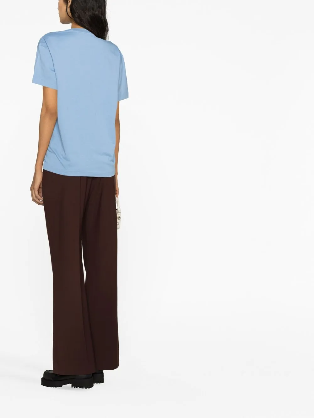 Голубой, хлопок, принт с логотипом на груди, круглый вырез, приспущенные плечи, короткие рукава и прямой подол.