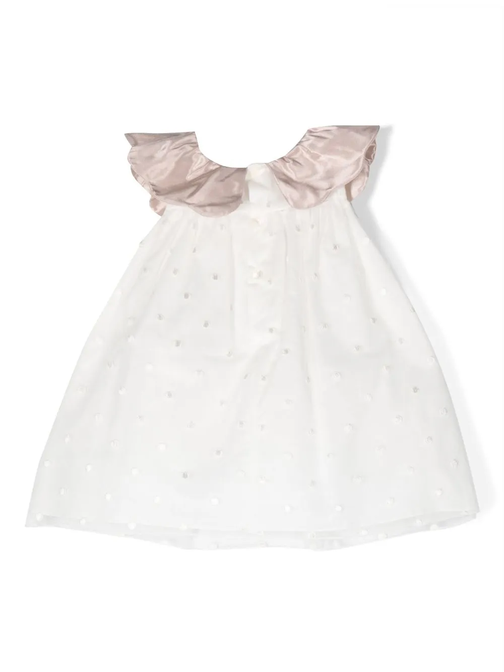 Белый, светло-розовый, хлопок, верхний слой из тюля, вышивка с узором в горох, вставки с оборками, контрастный воротник, застежка на пуговицы сзади, без рукавов, расклешенная юбка и блумеры в комплементарной расцветке.